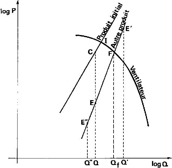 Pour le débit donné Q, les pertes de charge dans les conduites seront identiques; les pertes de charge au passage gaine-produit et dans le produit devront être recalculées. Soit E le point figuratif de la perte de charge totale pour le débit Q. Par E on trace la courbe de fonctionnement de l'installation EE'E" homologue de la courbe CC'C'' pour le produit initial. L'intersection de la courbe EE'E'' avec la courbe caractéristique du ventilateur définit le nouveau point de fonctionnement, d'où l'on déduit le débit de ventilation Qf et le débit spécifique obtenu (Fig. 163).