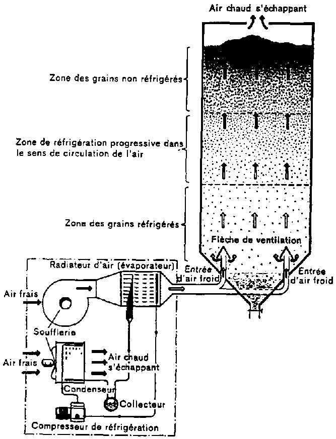 L'objectif essentiel de la ventilation est d'abaisser ou de maintenir la température du grain. Son utilisation doit être raisonnée en fonction des températures et des hygrométries de l'air et du grain. Lorsque l'humidité relative de l'air est faible, la ventilation entraîne un léger séchage et un refroidissement complémentaire. Avec de l'air humide la ventilation est délicate mais possible lorsque la température du grain est supérieure de 4 à 5° C à celle de l'air. En entrant dans le grain il se réchauffe légèrement et son humidité relative diminue, limitant ainsi les risques de réhumidification du grain. Un programme d'études et d'essais devrait être conduit pour aboutir à des recommandations pratiques aisément vulgarisables en zone tropicale.