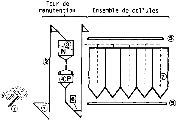 Extérieurement un centre de stockage apparaît comme un ensemble de cellules auquel est accolée une tour de travail (manutention, pesée, nettoyage, désinsectisation, etc.) selon le schéma ci-dessous: