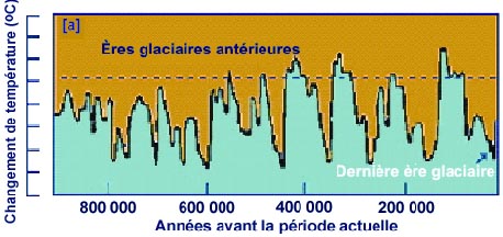 Figure 1a Représentation sur 900 000 ans des changements des températures superficielles de la Terre, tels que les interprètent de nombreux paléoclimatologues à partir des traces enregistrées dans les strates des roches sédimentaires, les sédiments stratifiés déposés sur le fond des océans, les glaces des hautes comme des basses latitudes, et pour les périodes plus récentes les anneaux de croissance du bois et d'autres témoins à stratification temporelle. Des baisses massives de température ayant eu pour effet de fortes expansions glaciaires se sont produites plus de dix fois sur la période, le réchauffement interglaciaire le plus récent s'étant produit il y a seulement environ 18 000 ans. Cela suggère que nombre d'espèces ont dû recoloniser les zones de hautes latitudes (>45 degrés nord ou sud) depuis que le couvert glaciaire s'est retiré.