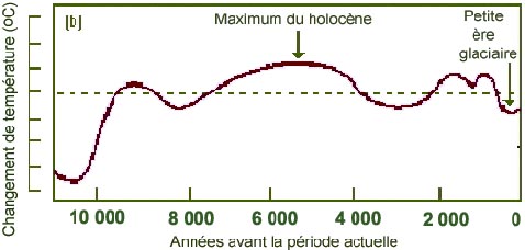 Au cours des dernières décennies, des chercheurs de pointe en paléoclimatologie - en travaillant à partir d'enregistrements anciens conservés dans les calottes glaciaires, les sédiments océaniques côtiers et lacustres, les coraux et autres organismes vivants - sont parvenus à la conclusion remarquable que des changements spectaculaires se sont fréquemment produits dans le climat, à des échelles de temps allant de quelques années à quelques décennies. Par exemple un groupe de paléoscientifiques a étudié les empilements de sédiments lacustres du lac Elk, dans le Wisconsin (Anderson 1992; Dean et al. 1984). Au moyen d'une panoplie de techniques modernes, à partir des sédiments annuels empilés dans les carottes extraites et représentant des séquences pouvant aller jusqu'à 11 000 ans, ils ont constaté que des transformations écologiques déterminées par le climat et faisant passer d'un écotone de prairie à la forêt boréale, puis à la forêt de la façade orientale nord-américaine se sont produites en l'espace de quelques années ou d'une décennie.