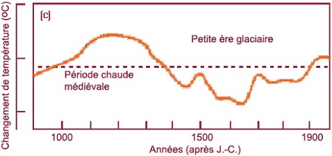 Figure 1c Représentation de la température mondiale depuis l'an 900 de notre ère, avec toujours pour repère la ligne de référence de la température moyenne. Ce graphique commence vers le milieu de la double bosse de droite de la figure 1b. A noter que l'échelle de temps est le calendrier moderne.
