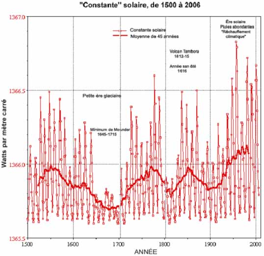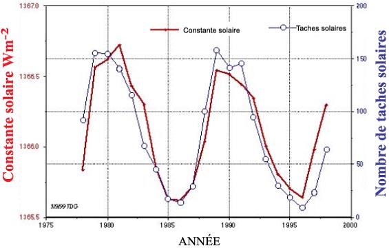 Alors qu'il est maintenant clair que l'émission radiative solaire n'est pas une «constante», d'après les mesures satellitaires faites depuis 1979 la variation reste jusqu'ici relativement faible (~ 2 watts par mètre carré - voir les figures 2a et 2b) - mais la série chronologique disponible est bien courte. En dépit de cette variation relativement petite, de très nombreuses études mettent en évidence des changement climatiques qui suggèrent que le double cycle solaire (2 x 11-13 ans), soit environ 22 ans, de rayonnement et d'inversion du champ magnétique solaire est aussi en cause (Friis-Christensen et Lassen 1991) et se manifeste souvent dans les variations hydrologiques régionales (cf. Perry 1994; 1995; 2000).