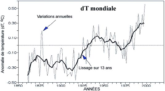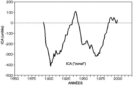 L'un des indices des changements climatiques mondiaux est l'anomalie de température de l'air en surface (dT), qui est mesurée sans interruption depuis 140 ans. La variabilité annuelle de dT est réputée être très forte, et un lissage considérable (sur 13 ans) des séries chronologiques correspondantes est nécessaire pour faire apparaître les tendances à long terme de la température (figure 3a). Les séries chronologiques lissées de dT en moyenne annuelle (figure 3b) font apparaître des fluctuations multidécennales avec des maxima dans les années 1880, les années 1930, et les années 90 (Halpert et Bell 1997; Bell et al. 2000), tandis que l'ICA (figure 3c) y répond également. Ces fluctuations se produisent sur le fond d'une tendance séculaire à l'élévation de la température de 0,06°C/10 ans (Sonechkin, Datsenko et Ivaschenko 1997, Sonechkin 1998).