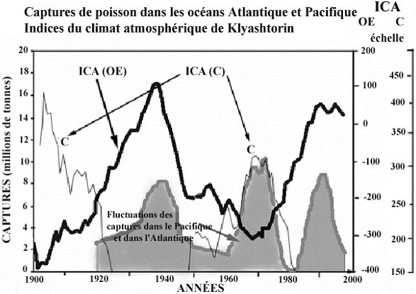 L'occurrence de chaque élément (C, O ou E) est définie comme le nombre de jours pendant lesquels s'exerce le déplacement dominant de la masse d'air. La somme des occurrences de chacune des trois composantes pour l'année égale 365. Pour chaque série d'années, l'occurrence du transfert atmosphérique dominant s'exprime par l'anomalie de transfert atmosphérique (l'anomalie AT) qui, comme il est montré, est le résultat de la soustraction de la moyenne correspondante pour une période de temps définie. Ainsi la somme des anomalies AT des trois composantes de base (C, O et E) pour la même période est toujours égale à zéro. La série chronologique résultante (anomalie AT cumulée) est dénommée indice de circulation atmosphérique (ICA), où l'ICA est la série chronologique des anomalies intégrée pour une période quelconque de mesures. Klyashtorin (1998) fait valoir la forte corrélation entre les prises commerciales de poissons dans les grandes pêcheries du monde et les ICA calculés par l'Institut russe de l'Arctique (figure 4).