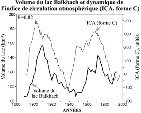 Figure 5 On constate la bonne concordance entre le volume du lac Balkhach et la forme de l'ICA - C (méridionale) de l'indice climatique atmosphérique de Klyashtorin (ci-dessus). La mer d'Aral et les autres bassins hydrologiques régionaux manifestent depuis récemment une tendance à reprendre du volume. Ces données appuient également des prévisions raisonnablement positives de changements écologiques.