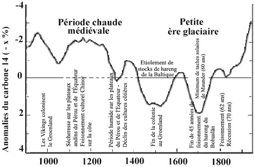 Figure 6 Représentation d'une série chronologique d'anomalies C14 résultant des émissions solaires, mise en regard de réponses sociétales caractérisées et d'informations corrélées relatives tant à l'accroissement des stocks de hareng de la Baltique qu'à la constitution de la Ligue hanséatique, correspondant aux réchauffements et aux refroidissements spectaculaires autour de la «petite ère glaciaire» dans la région. Au cours de cette période les colonies de nordiques en Islande et les cultures péruviennes des basses terres et des hauts plateaux ont connu des changements très profonds. Beaucoup d'autres changements sociétaux sont corrélés avec des changements du climat, tant soudains que progressifs, ce qui appuie la thèse que les cultures humaines, elles aussi, ont répondu aux changements du climat au même titre que toutes les espèces au cours de l'histoire de la Terre.