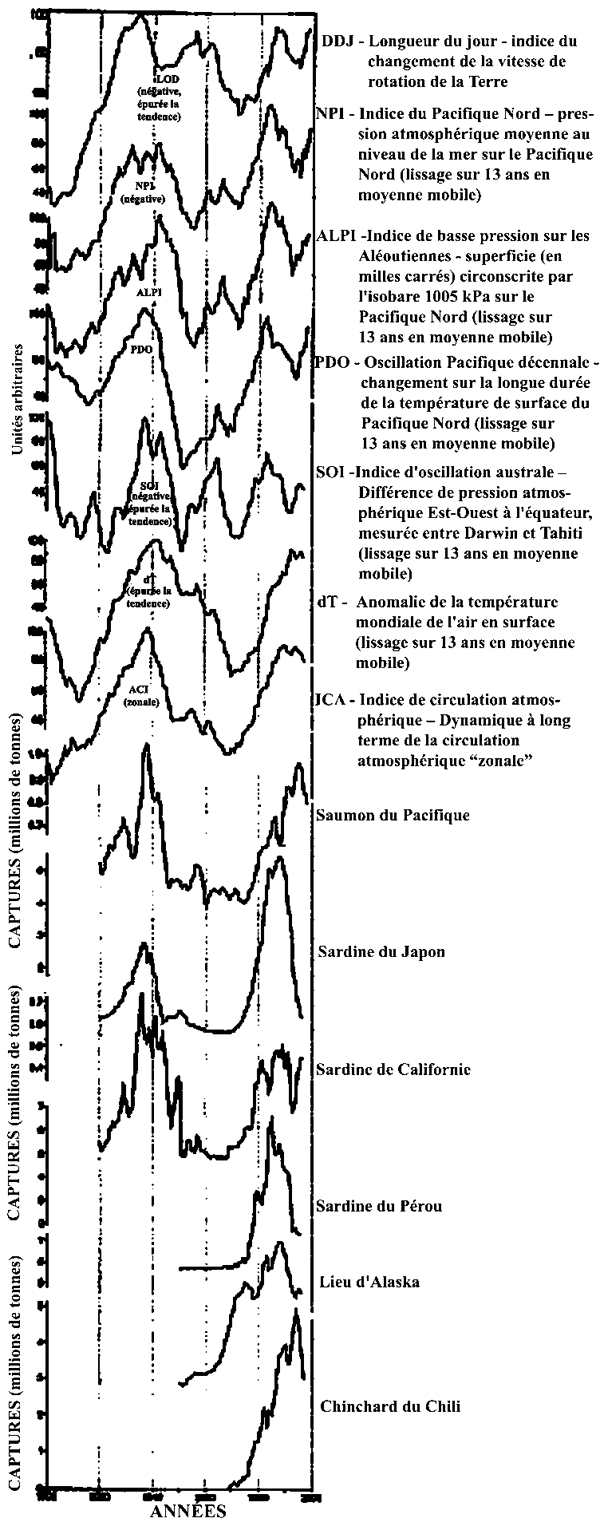 Le climat est le schème saisonnier moyen prévisible à long terme, tandis que le temps (au sens météorologique) est l'ensemble des phénomènes saisonniers plus variables qui sont observés. La séquence la plus puissante et la mieux identifiable d'événements produits par l'interaction atmosphère/océan qui perturbe les schèmes saisonniers prévisibles du climat correspond aux événements chauds et froids dus à l'oscillation australe et connus sous les noms de El Niño et La Niña. Mais l'intensité et la fréquence de ces événements varient dans le temps, à une échelle décennale et sur une durée plus longue, comme le montre la figure 10. Aussi faut-il reconnaître que le climat - et la productivité relative des océans (cf. Hubbs 1960; Laevastu et Favorite 1980; Nixon 1982, 1988, 1997; Ebbesmeyer et al. 1991; Murawski 1993; Polovina, Mitchum et Evans 1995; McGowan, Cayan et Dorman 1998; Reid, Planque et Edwards 1998; Reid et al. 1998; Hollowed et Wooster 1992, 1995) - varient sur plusieurs échelles de temps et d'espace simultanément, fait que révoquent pour excès de complexité Hilborn et Walters (1992), auxquels je réponds que «si les faits ne sont pas observés et expliqués, quelle valeur accorder aux évaluations et aux analyses qui les négligent?». Cependant les indices climatiques et les foisonnements et dépérissements successifs des espèces halieutiques suivent des cycles analogues (figure 11). La vraie question est de savoir si, une fois encore, il existe un lien causal direct, ou s'il ne s'agit que des conséquences corrélées de processus à plus grande échelle. Les réponses résident dans le suivi des processus associés et dans le collationnement des observations à toutes les échelles de temps et d'espace.