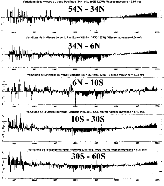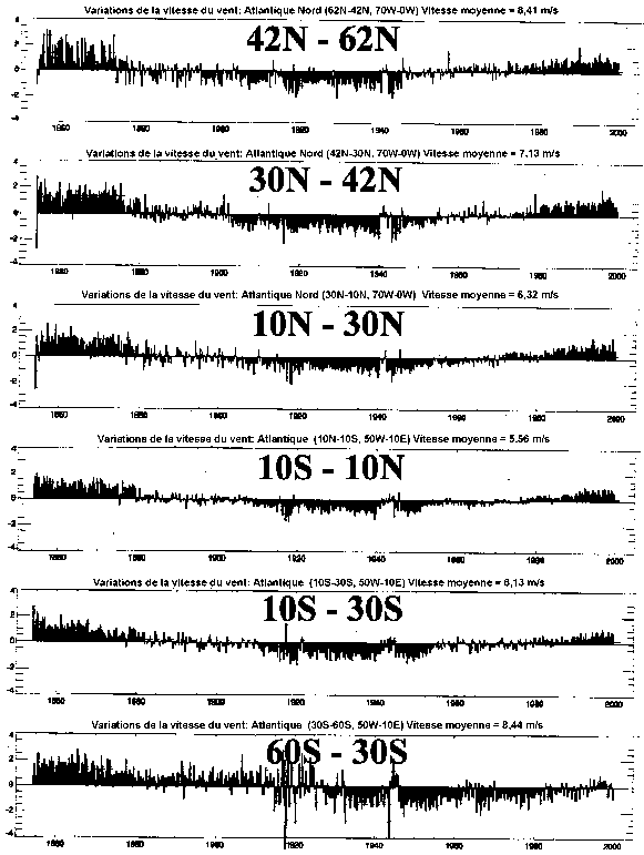 A partir des études de l'histoire du climat de la Terre et des observations météorologiques faites systématiquement depuis 1854, on peut affirmer que la dernière moitié du vingtième siècle ne s'est pas caractérisée par une forte dynamique saisonnière, relativement parlant. Les données globales sur l'océan et l'atmosphère qui ont été compilées pour la recherche sur le climat livrent un enseignement important, à savoir que les signaux climatiques les plus forts résident dans les mois d'hiver plutôt que dans les autres saisons ou dans les moyennes annuelles. Les tendances hiver seulement sont donc le bon gisement où chercher quelles bonnes questions se poser sur les variations du climat. Les figures 12a, b, et c montrent les écarts du vent de surface en hiver par rapport à la moyenne à long terme depuis 1854. A noter que bien que les échelles varient avec la latitude et les bassins océaniques, les schèmes sont tout à fait semblables, avec de courts décalages ou retards régionaux. On notera aussi la lente et monotone tendance à la hausse des 50 dernières années, contrairement au siècle précédent.
