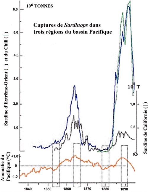 Figure 7 Représentation mise à jour de la désormais célèbre trilogie de la sardine du Pacifique, de Kawasaki et al. (1991), dans laquelle les tracés des changements de température de l'océan au large de la bande côtière du Japon mettent en évidence, de manière lumineuse, la relation entre les foisonnements de populations et les tendances à la hausse des températures de surface de l'eau - comme point de départ. Les baisses de population semblent être liés au refroidissement de l'océan (dans les périodes d'upwelling sous l'effet de vents de terre - voir figure 4 - et de facteurs connexes).