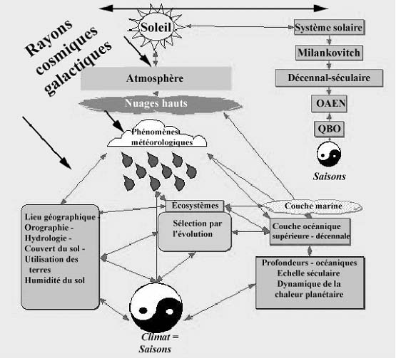 Figure 9 Les rapports entre les facteurs expriment quelques interactions classiques soleil/climat/conditions écologiques. Ce n'est là qu'une représentation sténographique de processus très complexes et non linéaires qui sont dans bien des cas difficiles à mesurer et à modéliser. Chacun opère à des échelles très différentes de temps et d'espace. Noter que tous ces processus se déroulent sous une grêle continue de rayons cosmiques galactiques (cf. Ed Mercurio à son adresse Internet pour un inventaire des sites Web), arrivant de toutes les directions et de myriades de sources au delà de notre influence, ou de nos connaissances générales, qui exercent un forçage dans les processus que nous percevons mal.
