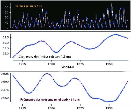 Figure 10 Représentation mettant en regard la fréquence des événements chauds dus à l'oscillation australe d'après Quinn (1992), la fréquence des taches solaires (en haut) et la fréquence des taches solaires lissée en moyenne mobile sur 11 ans (milieu). Quinn a utilisé les données hydrographiques du Nil, les journaux de bord de navires, et différentes données recueillies dans le cadre de missions diverses, dans des postes avancés et des archives familiales pour bâtir sa série chronologique. A noter que les fréquences les plus basses s'étendent d'environ 1890 jusque vers 1975, ce qui suggère que les températures mondiales moyennes n'ont pas grand chose à voir avec les événements chauds dus à l'oscillation australe.