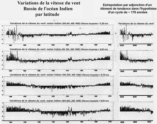 Figure 12 Séries chronologiques de la variation de la vitesse du vent par rapport aux vitesses moyennes (données zonales) depuis 1854 pour les tranches de latitude des trois grands bassins océaniques, a) Atlantique; b) Pacifique; et c) Océan Indien. Noter la similitude des tendances présentées par chaque série et pour l'ensemble des régions. Les données relatives à l'océan Indien c) sont flanquées sur leur droite de la reproduction de la partie gauche du graphe pour dessiner la tendance probable si elle suit le cycle de 170 à 180 ans que suggèrent les indices paléologiques qui donnent la mesure de l'activité solaire, et sur lesquels Fletcher se fonde pour édifier des prévisions climatiques pour le vingt et unième siècle.