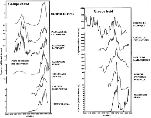 Le principal enseignement qui a présidé aux activités ultérieures de renforcement des stocks est qu'il n'existe aucune garantie de la Nature quant succès du recrutement d'une année à l'autre (cf. Smith 1978; Csirke 1980; Sharp 1981 a,b; Bakun et al. 1982; Kawai et Isibasi 1983), ni quant à la stabilité de la population d'une décennie à l'autre (Kondo 1980; Csirke et Sharp 1983; Sinclair 1988; Ware 1995; Ware et McFarlane 1989; Ware et Thompson 1991). D'où l'échec générique de la plupart des modèles classiques de prévision des stocks basés sur des espérances «médianes» (Sharp, Csirke et Garcia 1983; Koslow, Thompson et Silvert 1987; Koslow 1992). La réponse évidente à la dynamique des espèces individuelles est le mieux exprimée par les différentes réponses individuelles des populations dans les principales pêcheries identifiées par Klyashtorin (1998, 2001) pour lesquelles on dispose de statistiques sur presque un siècle, ou une chronologie minimale à mettre en relation avec les causes et effets climatiques (voir figure 13 ci-après).