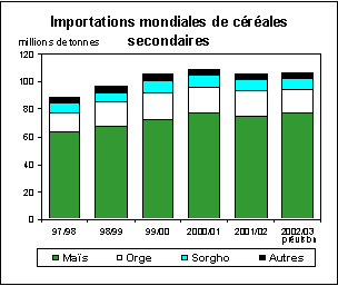 Les échanges mondiaux de céréales secondaires pendant la campagne de 2002/03 (juillet/juin) devraient atteindre 106,5 millions de tonnes, chiffre qui représente une hausse de 700 000 tonnes par rapport à l’an dernier, mais reste cependant inférieur de 2 millions de tonnes au volume record de 2000/01. Les importations des pays développés devraient atteindre 33 millions de tonnes, soit approximativement 4 millions de tonnes de moins que le résultat estimatif de l’an dernier, ce qui représente l’un des plus faibles volumes de ces quelques vingt dernières années. Le volume total des importations des pays en développement devrait avoisiner les 74 millions de tonnes, soit une progression de plus de 4 millions de tonnes par rapport à l’an dernier. Les échanges mondiaux de maïs devraient enregistrer la croissance la plus rapide en 2002/03 et atteindre le niveau record de 77 millions de tonnes. Cette progression de 2 millions de tonnes par rapport à la précédente campagne est due principalement à une demande accrue de la part de l’Afrique australe. Les échanges internationaux d’orge sont estimés à 17 millions de tonnes et reculent donc de 1,5 million de tonnes par rapport à l’an dernier, la principale raison étant une réduction des achats de la CE. Enfin, les importations de sorgho devraient avoisiner le volume de l’an dernier, estimé à environ 8 millions de tonnes. D’une manière générale, les échanges mondiaux des autres céréales secondaires, notamment avoine, seigle et mil, devraient également rester au même niveau que l’an dernier.