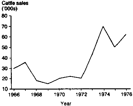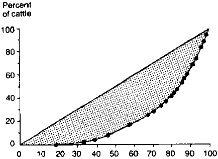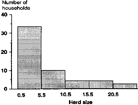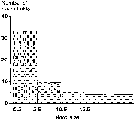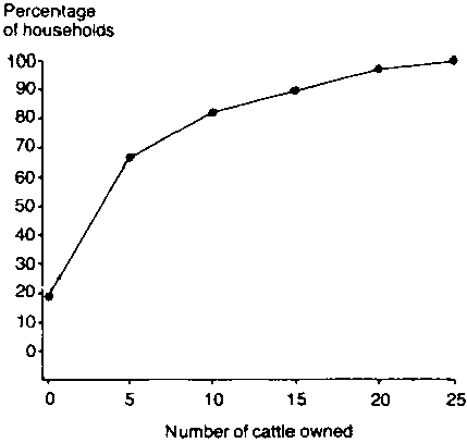 From this information, we might conclude that cattle holdings are not equitably distributed within the area, i.e. relatively few of the households own a large proportion of the cattle while a substantial proportion hold none. Inequitable distribution of livestock holdings is fairly common in Africa, and similar distributions are found for income received and/or assets held (Module 2, Section 1). Households with larger livestock holdings also tend to have greater access to resources such as water points (Module 10), but policies which aim to correct inequities of this nature are generally fraught with problems (Module 10, Part B).