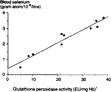 then b = 120.38/1339.13 = 0.090 So the estimated linear equation of the relationship between whole-blood selenium (Y) and glutathione peroxidase activity (X) is: Y = 0.33 + 0.090X This is the line drawn on Figure 12. Note that when X = 0, Y = 0.33, and if X is increased by 1, then Y is increased by 0.09. The equation Y = 0.33 + 0.090X can now be used to predict the whole-blood selenium (Y) from the glutathione peroxidase activity (X). For instance, when X = 30, the predicted value of Y is: Y = 0.33 + (0.090 x 30) = 3.03 |