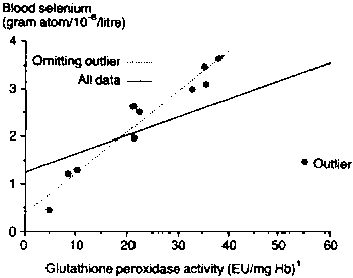Dangers of extrapolation. You may have noticed that in Table 15 and Figure 12, the values of glutathione peroxide activity (X) are limited to the range 0 to 40. We concluded that, for this region of observation, X and Y (whole-blood selenium) were highly correlated, and that the relationship was linear.