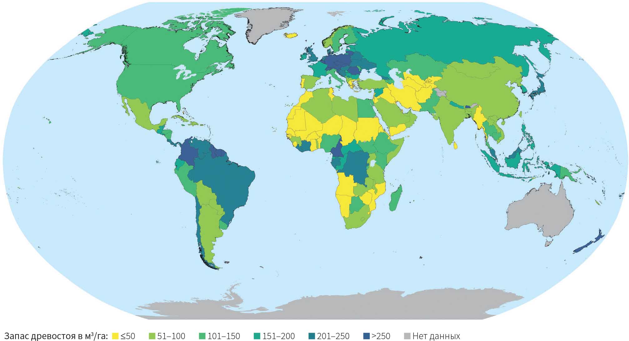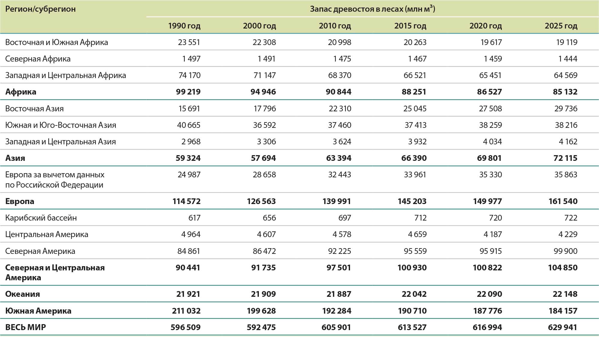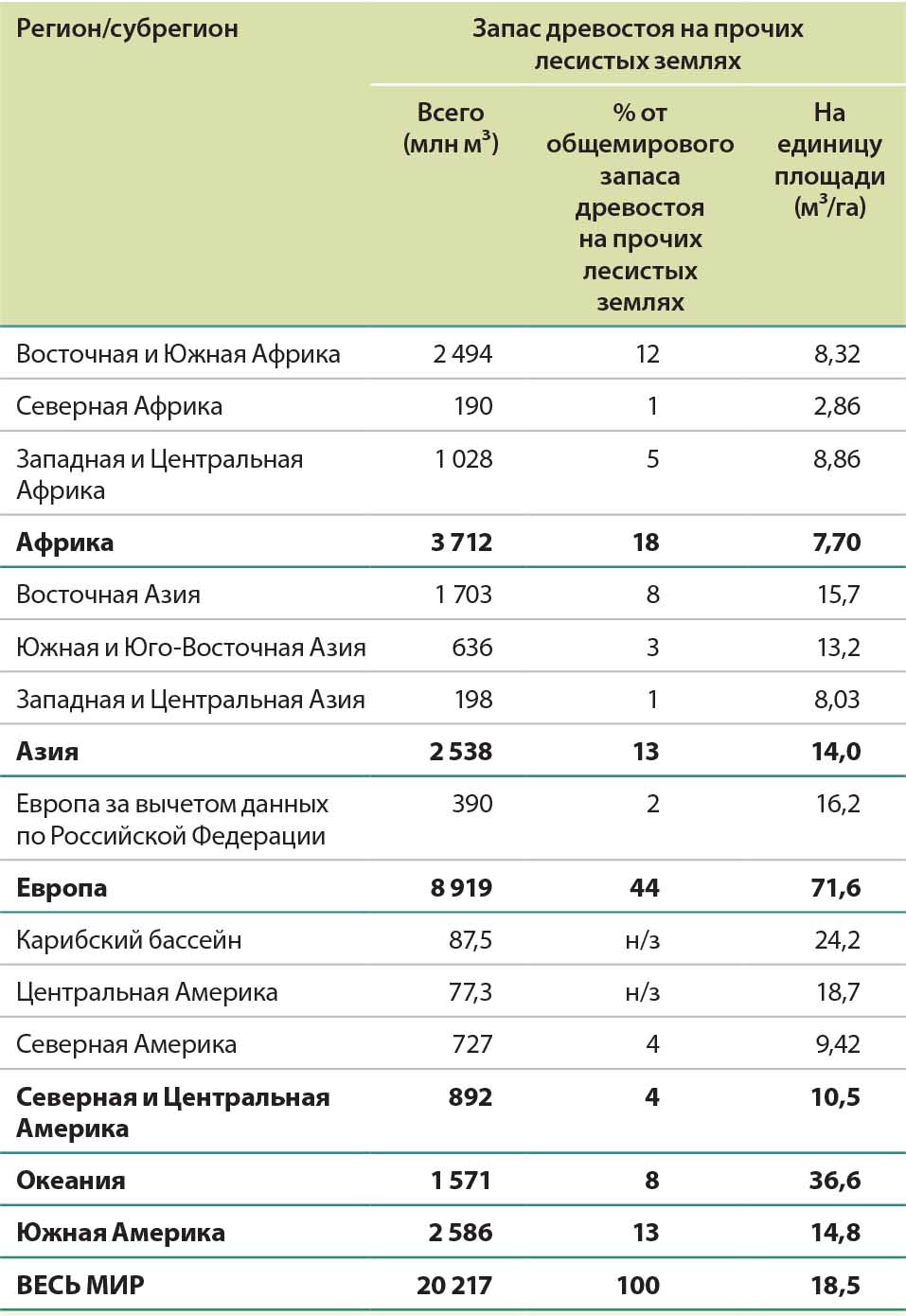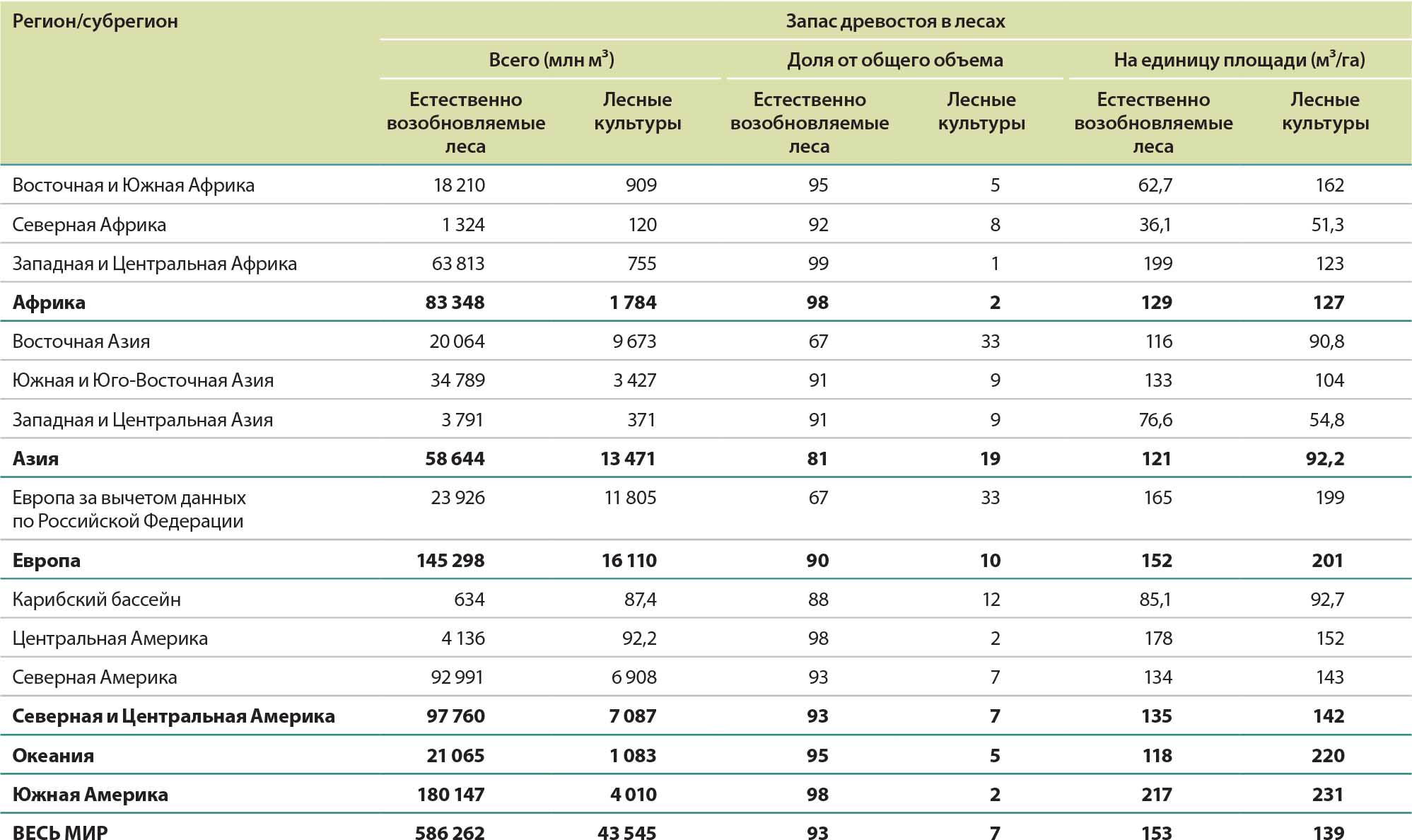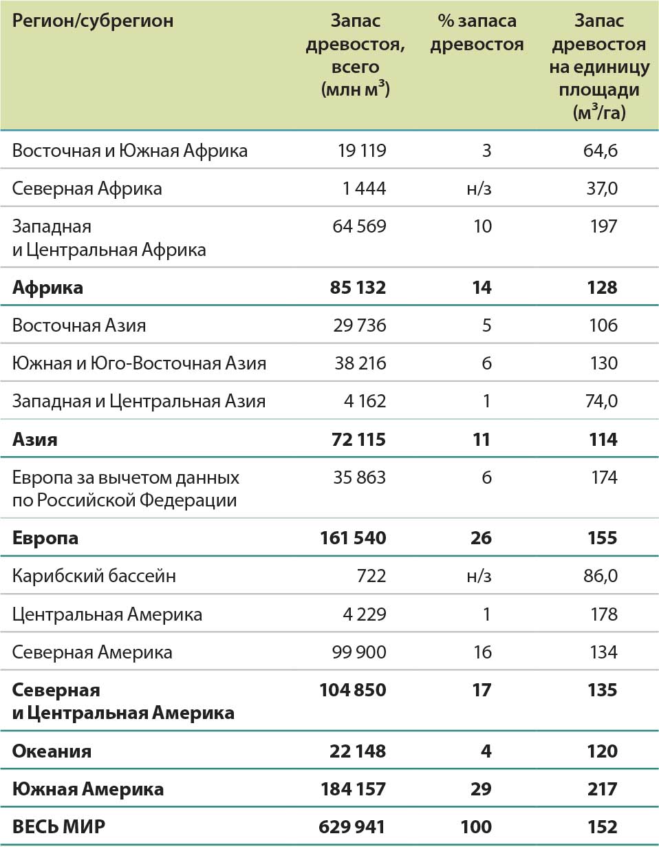 Мировой запас древостоя в лесах оценивается в 630 млрд м³, и наибольшая его доля (29 процентов) приходится на Южную Америку, за которой следует Европа (26 процентов) (таблица 36; рисунок 17). Среднемировой запас древостоя на единицу площади составляет порядка 152 м³/га, а на первых местах в мире по этому показателю находятся тропические регионы, среди которых лидируют Южная Америка (217 м³/га), Западная и Центральная Африка (197 м³/га) и Центральная Америка (178 м³/га). Из регионов, где преобладают умеренные и бореальные леса, на первом месте по запасу древостоя на единицу площади находится Европа (за вычетом данных по Российской Федерации) – 174 м³/га.