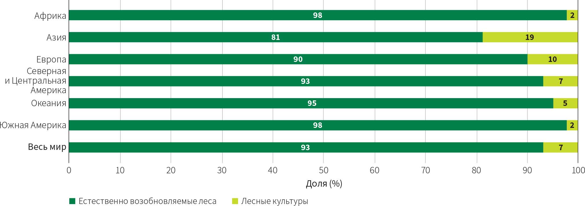 В 2025 году 93 процента запаса древостоя в мире составляли естественно возобновляемые леса, а 7 процентов – лесные культуры. На глобальном уровне средний запас древостоя на единицу площади в естественно возобновляемых лесах составляет 153 м³/га, а на площадях под лесными культурами – 139 м³/га (таблица 38). Отчасти это объясняется увеличением площади лесных культур в мире за последние несколько десятилетий, при том, что молодые лесные культуры еще не достигли максимального объема древостоя, а отчасти – более частыми рубками лесных культур. На первом месте по доле запаса древостоя на площадях под лесными культурами находится Азия (19 процентов), в основном за счет Восточной Азии. На последних местах по этому показателю находятся Африка и Южная Америка (рисунки 18 и 19).
