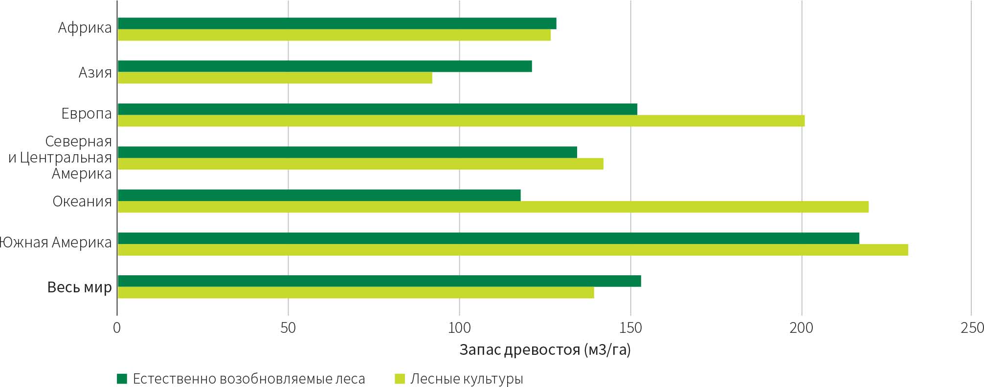 На глобальном уровне для группы «другие подкатегории лесных культур» в среднем характерна более высокая плотность древостоя (168 м³/га), чем для плантационных лесных культур (112 м³/га), но между регионами существует разброс по этому показателю. Плантационные лесные культуры, состоящие из интродуцированных пород, которые часто относят к быстрорастущим, характеризуются более высокой плотностью древостоя (146 м³/га), чем плантационные лесные культуры в среднем.