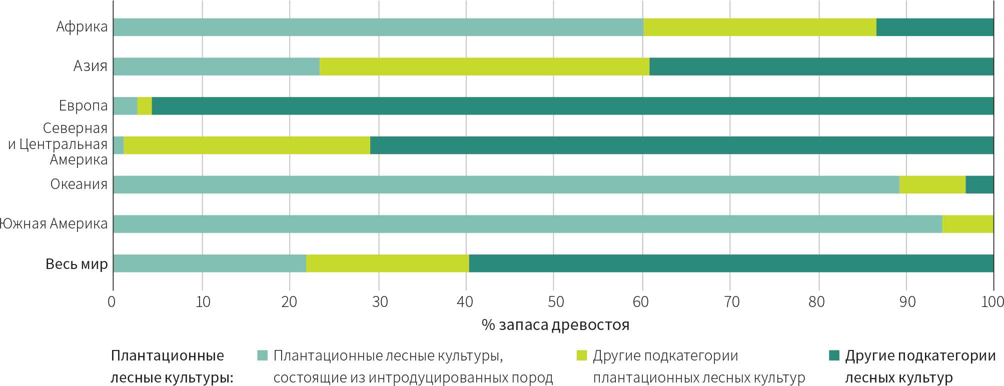 В региональном разрезе первое место по запасу древостоя, приходящегося на плантационные лесные культуры, занимает Азия – 8,18 млрд м³, или 47 процентов от общемирового объема древостоя, а второе – Южная Америка (4,00 млрд м³, 23 процента). В Южной Америке на плантационные лесные культуры находится почти весь запас древостоя лесных культур (99,8 процента); значительная доля этого запаса находится в таких лесах и в Океании (97 процентов) и Африке (87 процентов) (рисунок 20). В Европе на плантационные лесные культуры приходится лишь небольшая доля запаса древостоя лесных культур (4 процента).