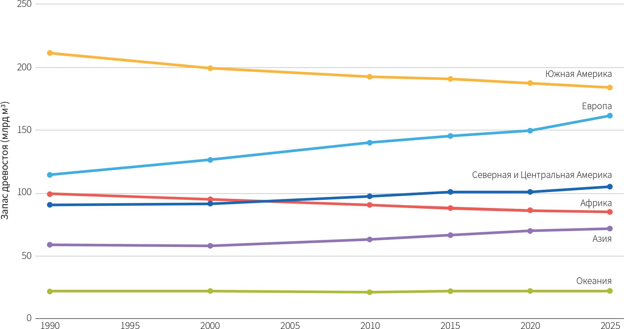 За спадом в 1990-х годах последовал активный рост: если в 2000 году запас древостоя в мировых лесах составлял 592 млрд м³, то в 2025 году – уже 630 млрд м³. Однако в регионах наблюдались разнонаправленные тенденции: в Европе (в частности, в Российской Федерации), Северной Америке и Азии в этот период регистрировался ощутимый рост рассматриваемого показателя, а в Южной Америке и Африке он заметно сократился (таблица 42, таблица 43 и рисунок 21). В ряде субрегионов тропического пояса, таких как Западная и Центральная Африка, в 2015–2025 годах наблюдалось замедление среднегодового уменьшения запаса по сравнению с 2000–2015 годами. А вот в Южной Америке сравнение этих двух периодов показало рост темпа сокращения запаса древостоя в лесах. В Центральной Америке в 2000–2015 годах запас древостоя в лесах рос (на 3,5 млн м³ в год), а в 2015–2025 годах сокращался (-43,1 млн м³ в год).