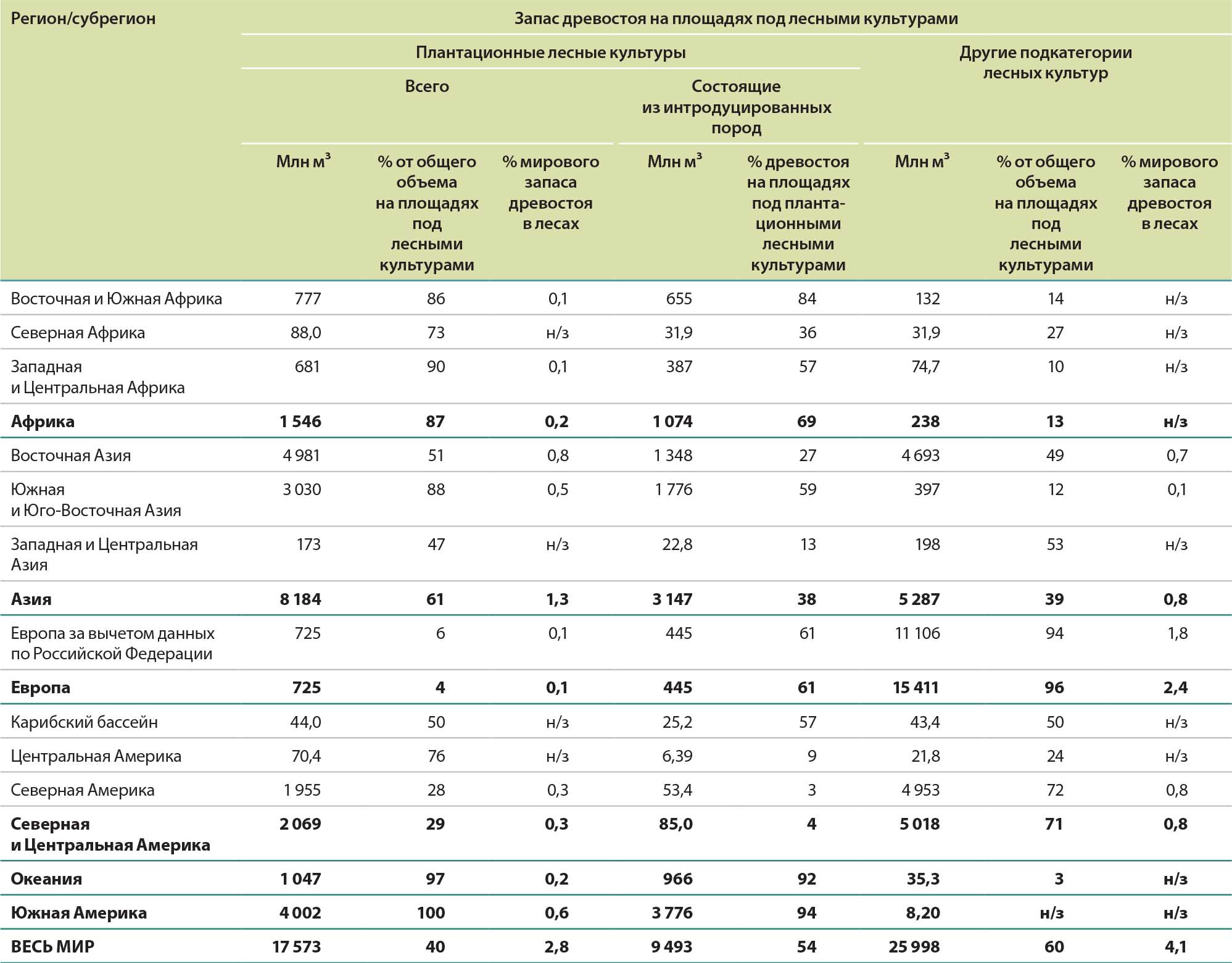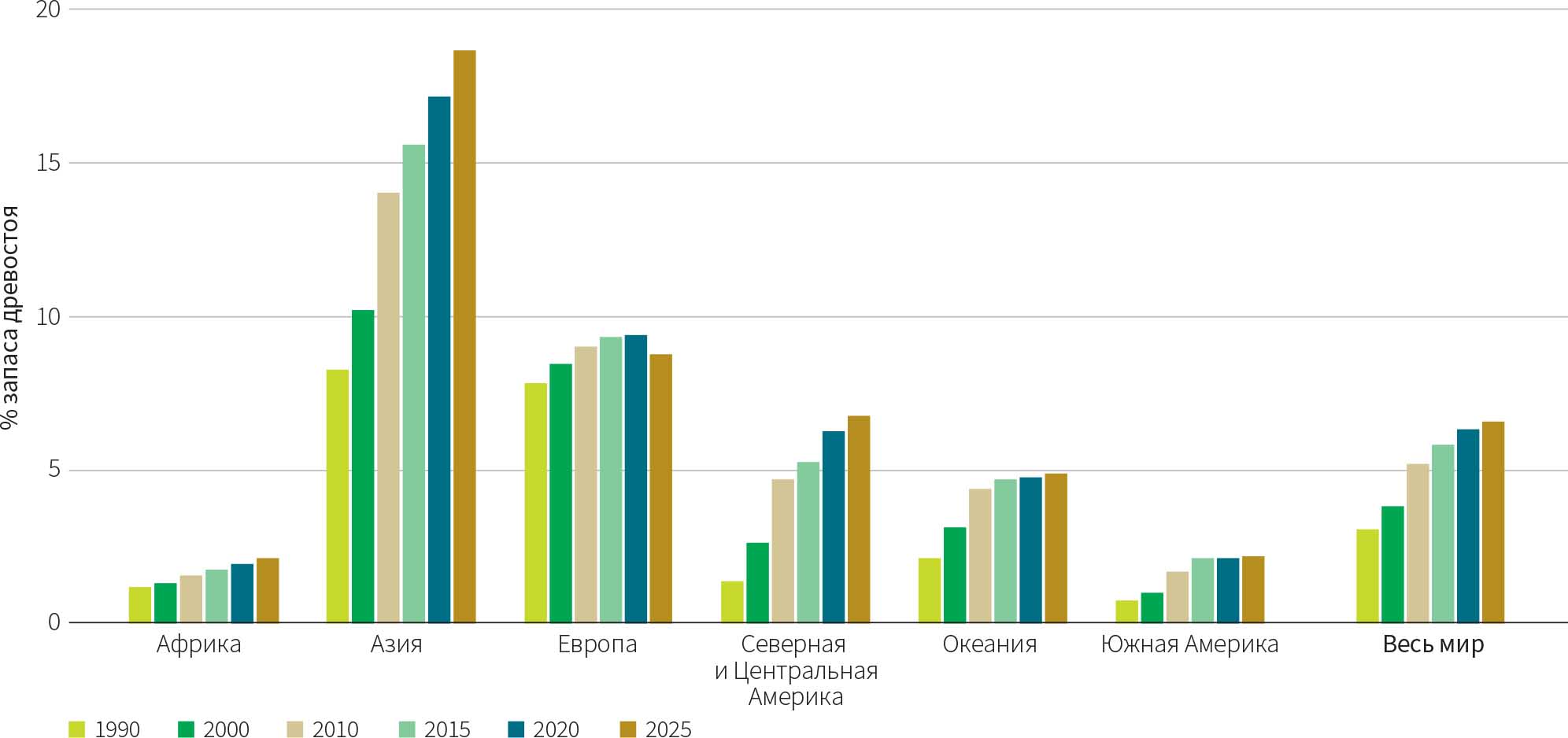 В 2025 году на плантационные лесные культуры приходится 3 процента запаса древостоя в лесах мира и 40 процентов запаса древостоя на площадях под лесными культурами (таблица 40). На другие подкатегории лесных культур приходится 4 процента от суммарного запаса древостоя в лесах и 60 процентов от суммарного запаса древостоя на площадях под лесными культурами.
