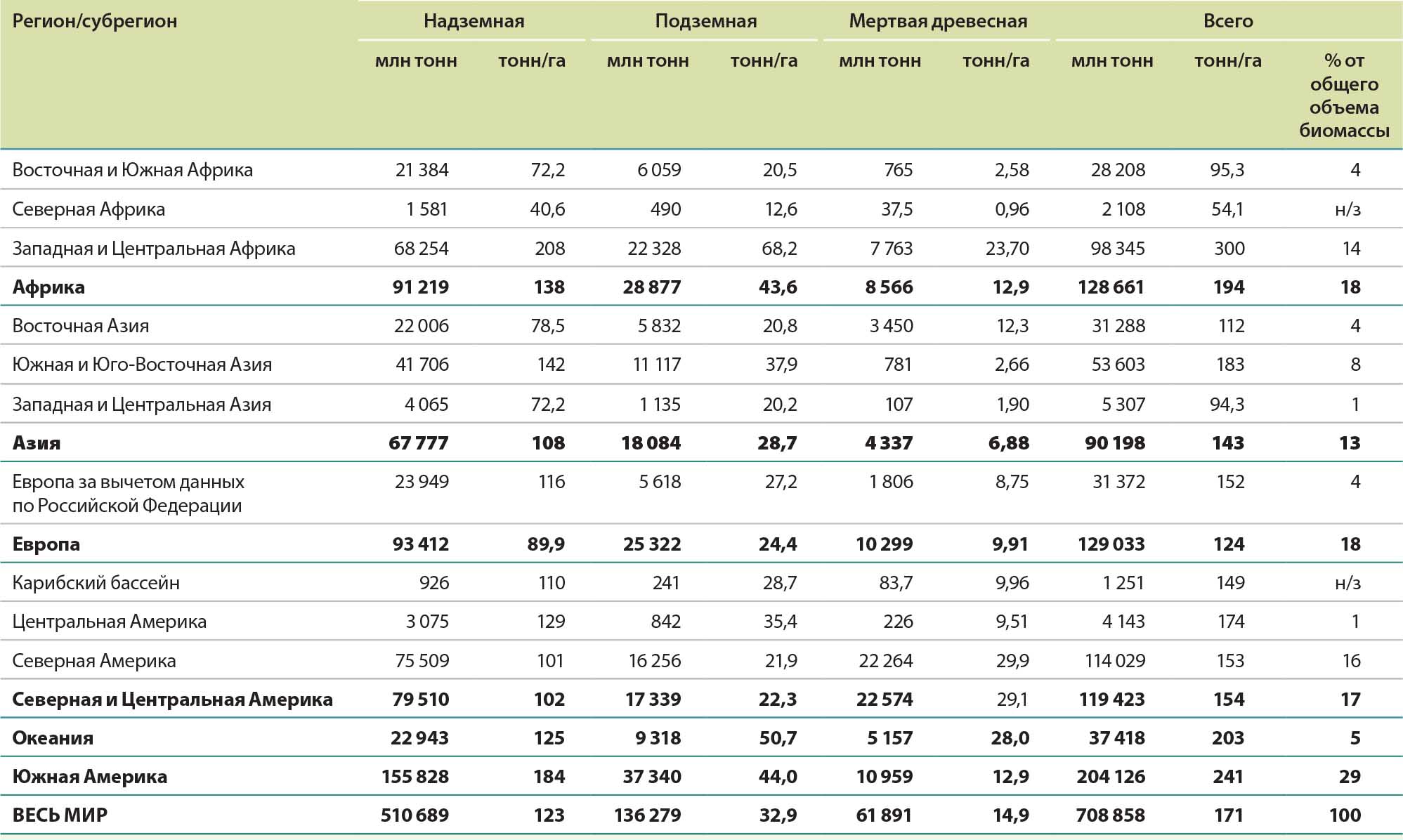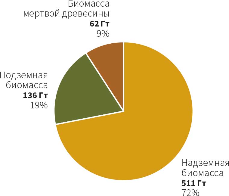 Общий объем биомассы в лесах планеты оценивается примерно в 709 гигатонн (Гт), что эквивалентно 171 тонне на гектар. Живая биомасса, включая надземную и подземную, составляет почти 647 Гт, или около 156 тонн на гектар (таблица 49). Из этого объема 79 процентов составляет надземная биомасса, а 21 процента – подземная. Биомасса мертвой древесины в мировых лесах оценивается в 61,9 Гт сухого вещества, что эквивалентно 14,9 тоннам на гектар и 9 процентов биомассы во всех лесах планеты (рисунок 23).