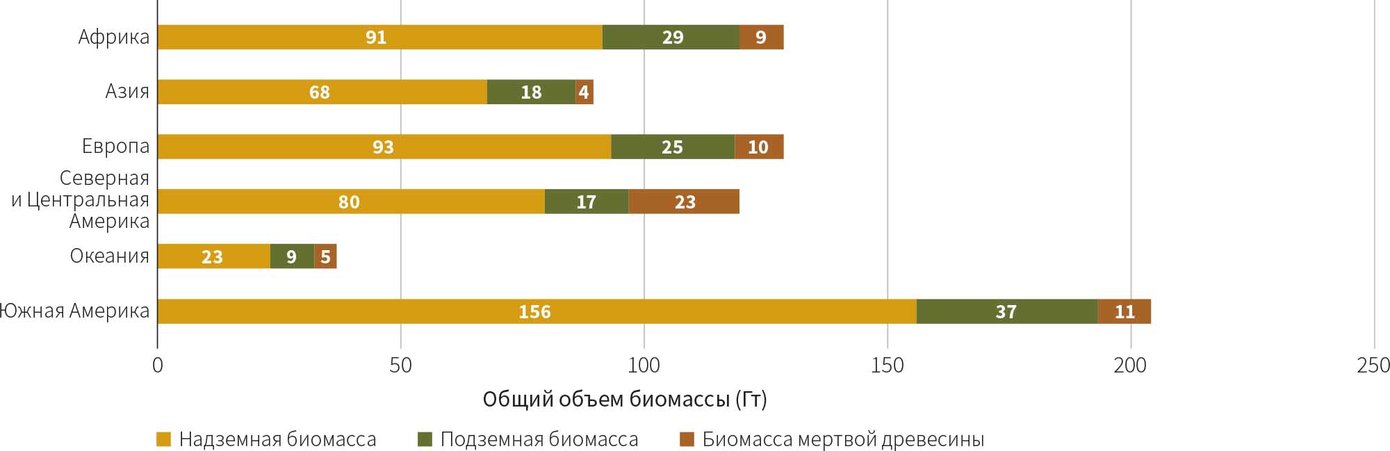 На региональном уровне самая большая доля мировой лесной биомассы – почти треть от общего объема – приходится на Южную Америку (рисунок 24). Самой высокой плотностью биомассы отличаются регионы, где растут тропические леса: например, в Океании и Южной Америке она превышает 200 тонн на гектар. В Африке объем биомассы на единицу площади в среднем составляет 194 тонны на гектар, а в Западной и Центральной Африке достигает 300 тонн на гектар.