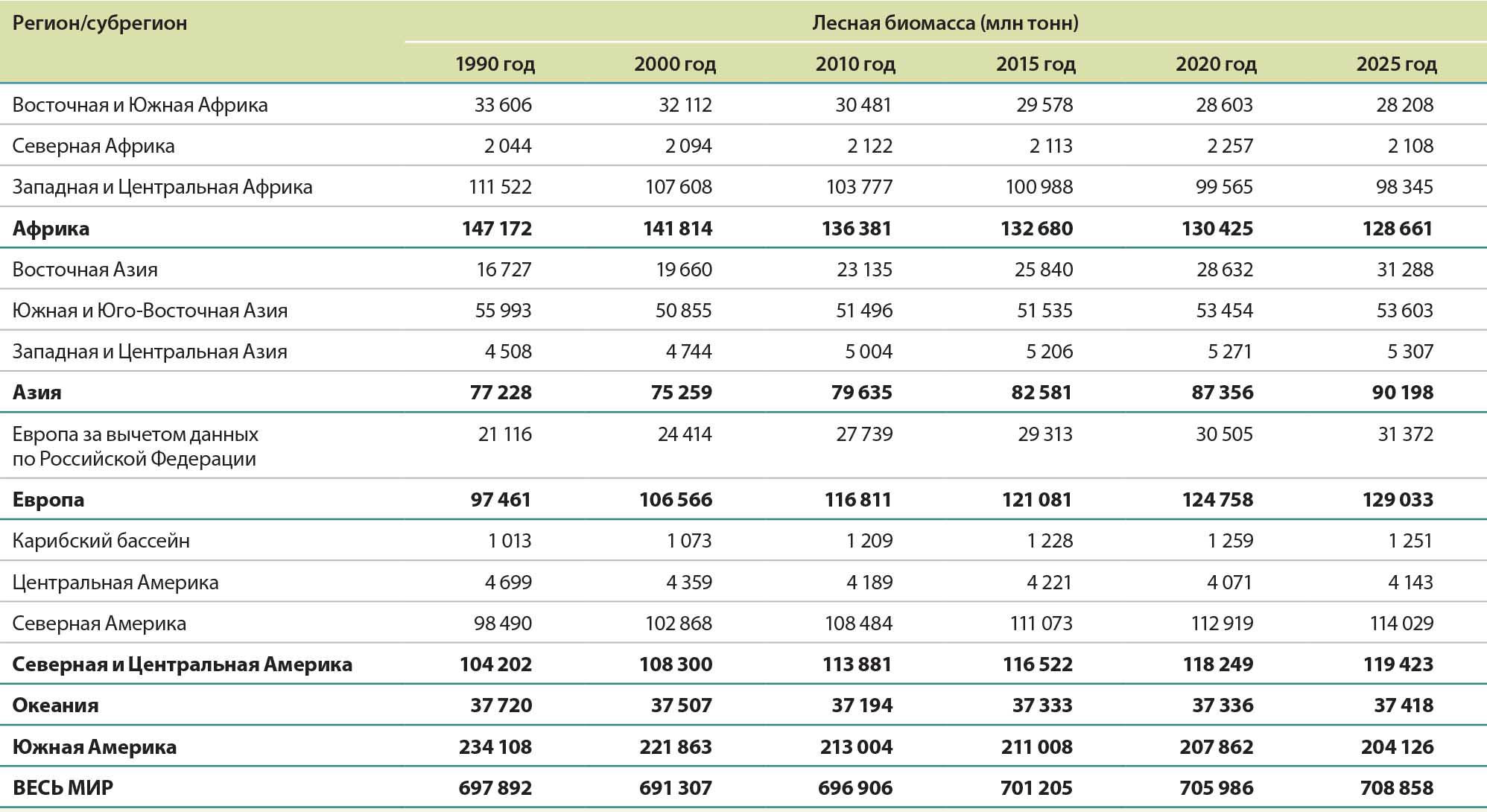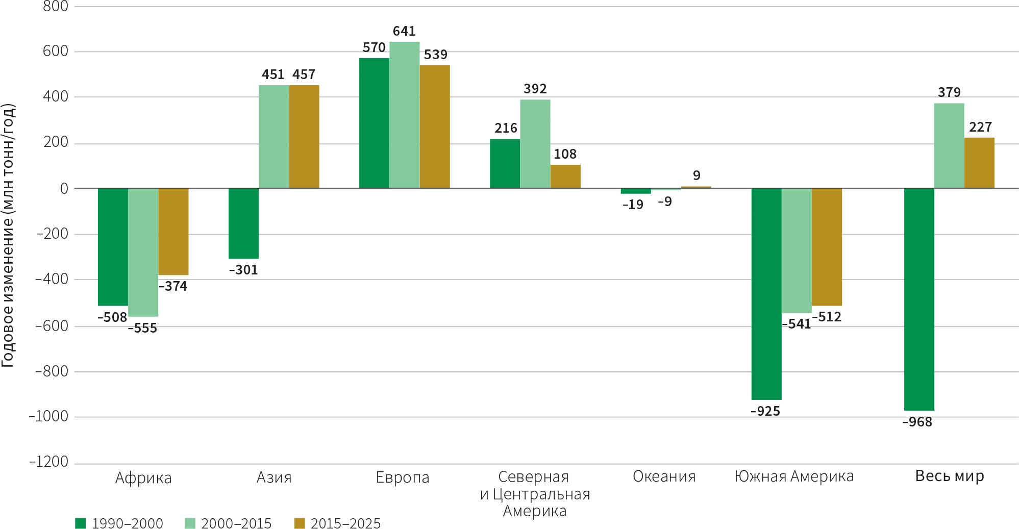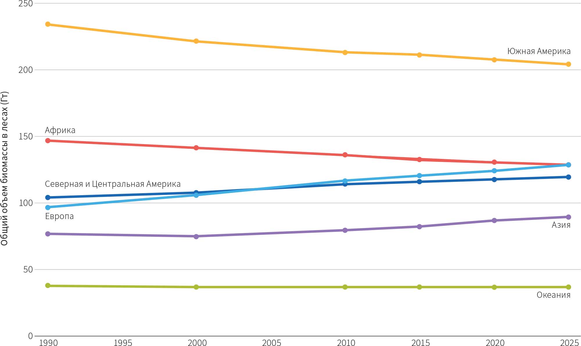 В 1990-х годах запас биомассы в мире снижался, а в 2000–2025 годах эта тенденция сменилась устойчивым ростом (таблица 50). За период с 1990 по 2025 год рост составил примерно 11,0 Гт (таблица 51) – 1,6 процента. Но по регионам наблюдаются разнонаправленные тенденции. В Южной Америке и Африке в этот период была зарегистрирована существенная убыль биомассы – 857 млн и 529 млн тонн в год соответственно (таблица 52), в основном за счет сокращения площади лесов. В Восточной Азии, Европе и Северной Америке наблюдался значительный рост биомассы, что объясняется расширением площади лесов и ростом объема биомассы на единицу площади (рисунок 25). В Азии, особенно в Южной и Юго-Восточной Азии, в 1990-х годах наблюдалось существенное сокращение биомассы, которое в период 2000–2025 годов сменилось ростом.