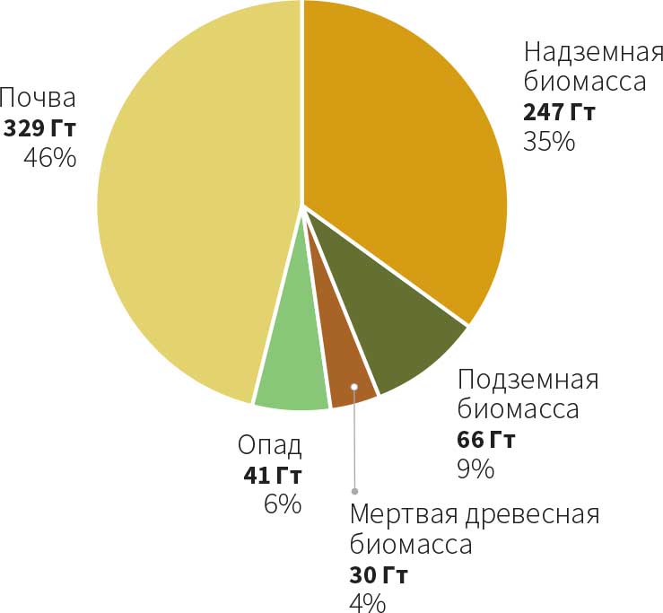 Общие запасы углерода в лесах в 2025 году по всем углеродным пулам в совокупности оцениваются в 714 Гт, что эквивалентно 172 тоннам на гектар (таблица 54). Эти запасы распределяются следующим образом: почвенный органический углерод – 329 Гт (46 процентов от общего объема), или 79,6 т/га; надземная биомасса – 247 Гт (35 процентов), или 59,7 т/га; подземная биомасса – 65,9 Гт (9 процентов), или 15,9 т/га; лесной опад – 41,1 Гт (6 процентов), или 9,93 т/га; мертвая древесина – 30,3 Гт (4 процента), или 7,32 т/га (рисунок 26).