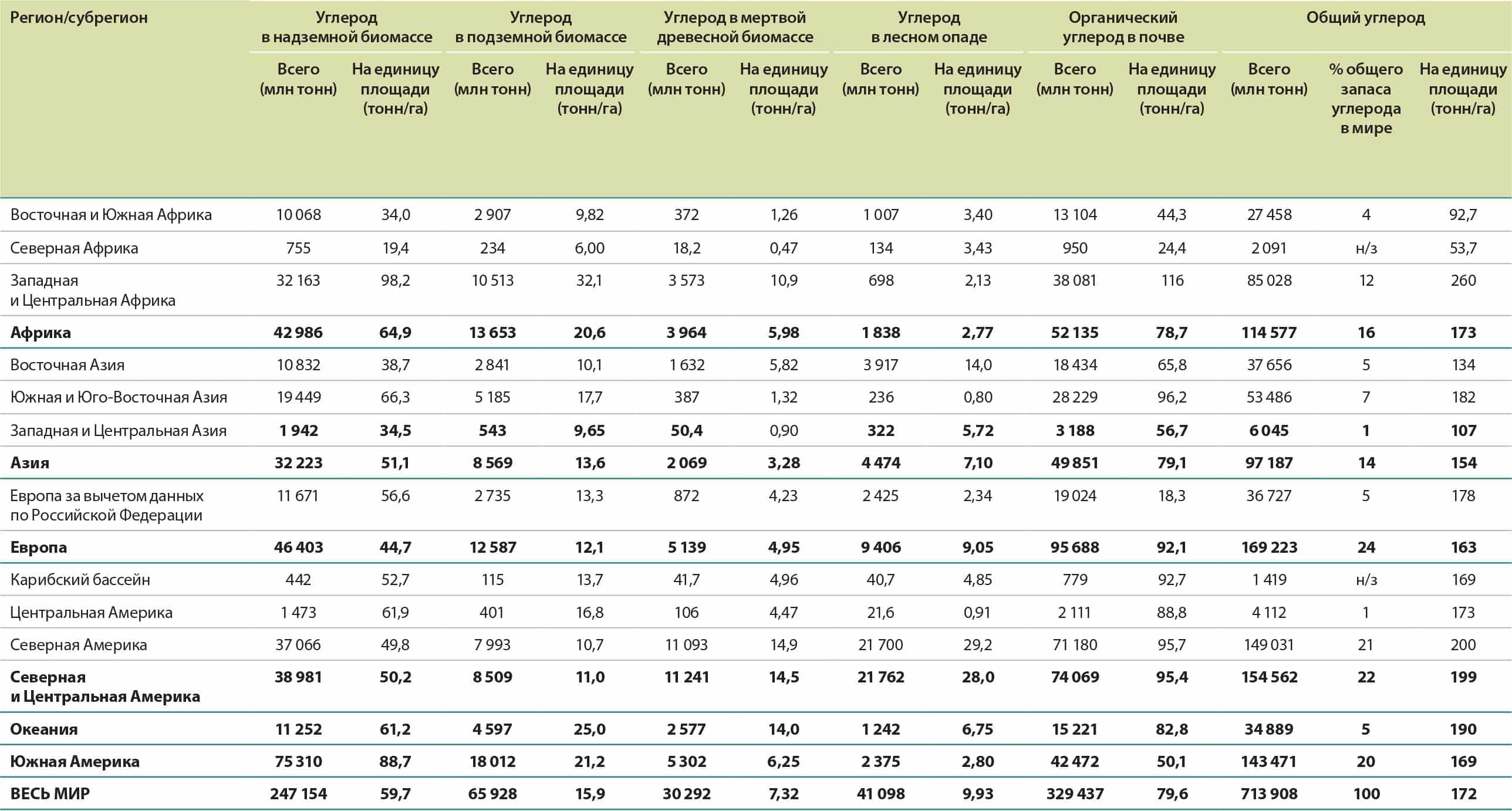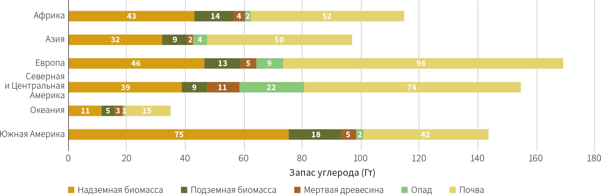 Следует отметить, что страны и территории в разных географических районах оценивали запасы органического углерода в почве до разной глубины. Взвешенная по площади лесов глубина почвы, до которой измерялся запас почвенного органического углерода, в среднем составляет 41 см, со следующими различиями по регионам: в Азии и Океании – 30 см; в Европе – 32 см; в Южной Америке – 34 см; в Африке – 41 см; а в Северной и Центральной Америке – 70 см.