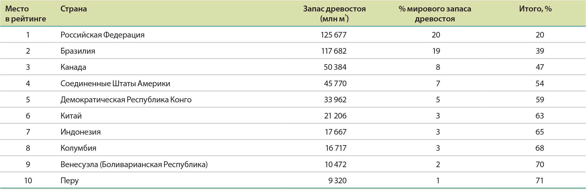 Почти 40 процентов мирового запаса древостоя приходится на две страны – Российскую Федерацию (126 млрд м³, или почти 20 процентов от общемирового объема) и Бразилию (118 млрд м³). Кроме того, не менее чем 5 процентов мирового запаса древостоя располагают (в порядке убывания, по объему) Канада, Соединенные Штаты Америки и Демократическая Республика Конго (таблица 37).