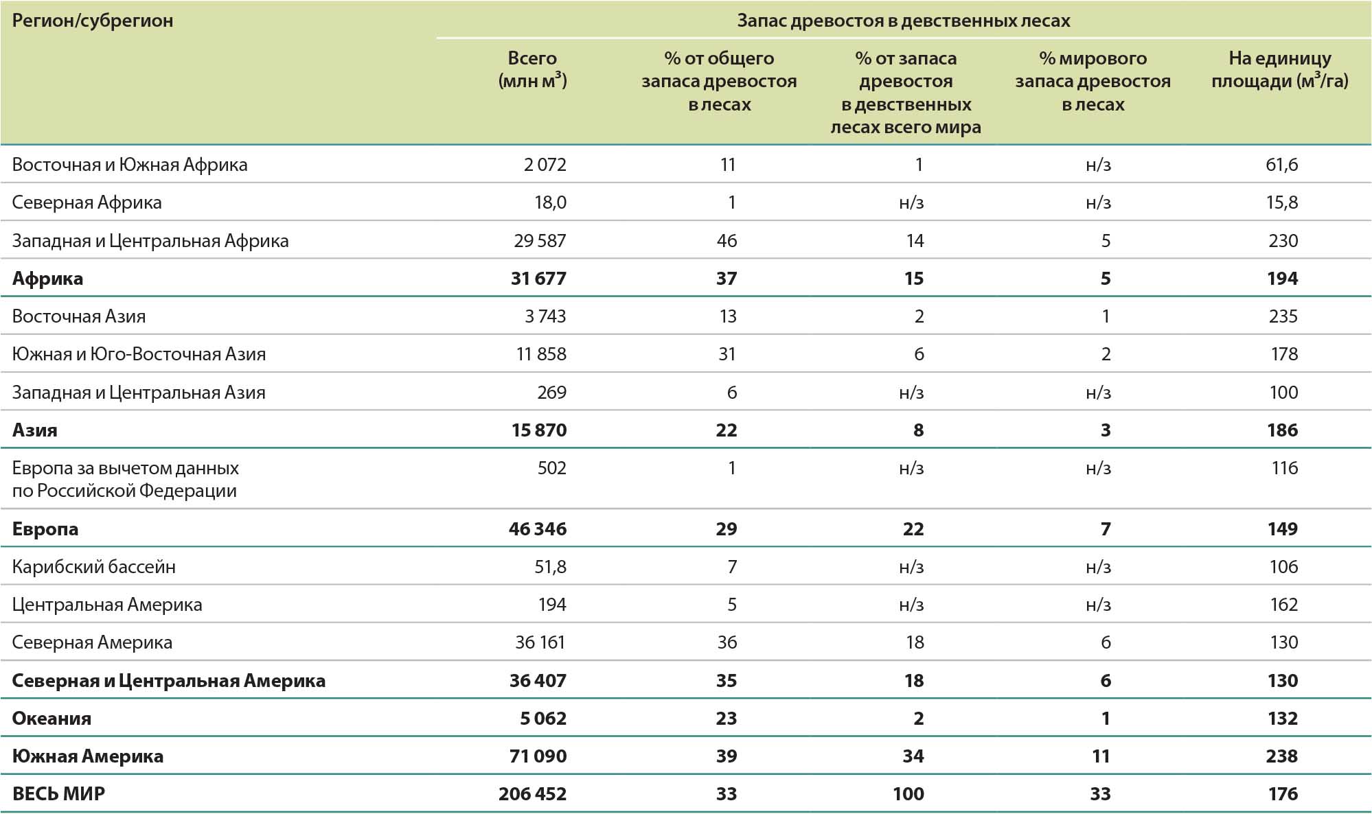 На девственные леса приходится приблизительно треть (33 процента) объема древостоя в лесах – 206 млрд м³ (таблица 39). Из регионов наибольшей долей мирового запаса древостоя в девственных лесах располагает Южная Америка (11 процентов), за которой следует Европа (7 процентов). На первом месте по мировому запасу древостоя в девственных лесах в процентном отношении к общему запасу древостоя находится Южная Америка (39 процентов); за ней следуют Африка (37 процентов) и Северная и Центральная Америка (35 процентов).