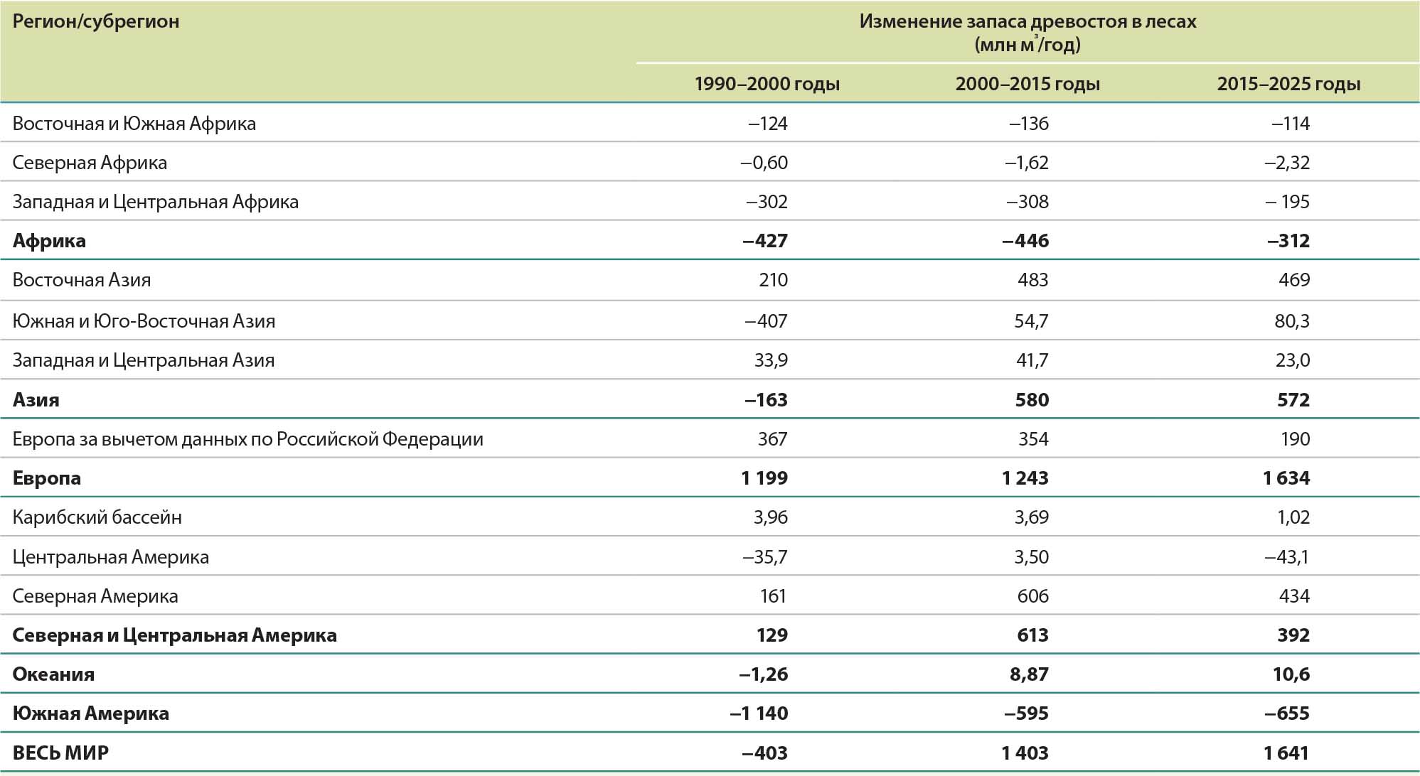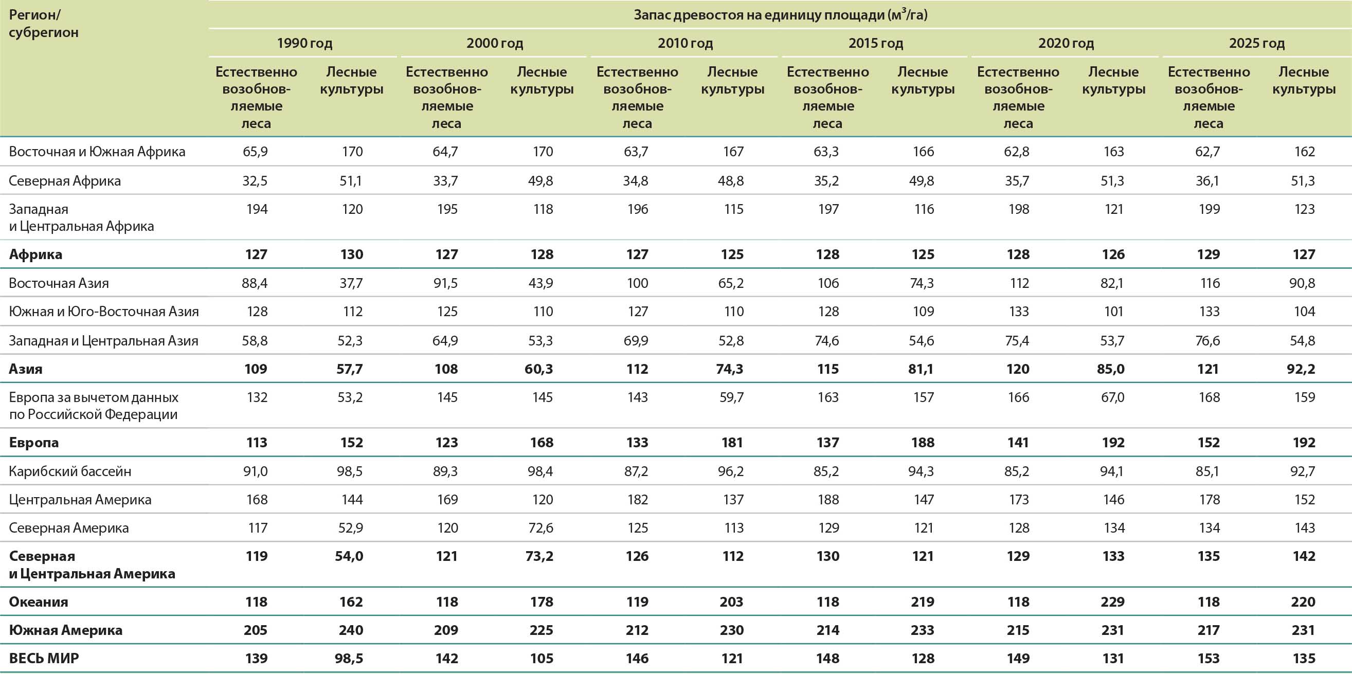 В период с 1990 по 2025 год запас древостоя в лесах на единицу площади увеличился на 11 процентов; рост был зарегистрирован во всех регионах и почти во всех субрегионах (таблица 44). Особенно заметным был рост в Европе и Восточной Азии – можно предположить, что эта динамика была обусловлена такими факторами, как повышение эффективности управления лесами и крупномасштабные программы лесовозобновления (особенно в Китае – Lu et al., 2018; Yue, Zhang and Shao, 2021). В Российской Федерации и Соединенных Штатах Америки в 2015–2025 годах также был зафиксирован значительный рост запаса древостоя на гектар.