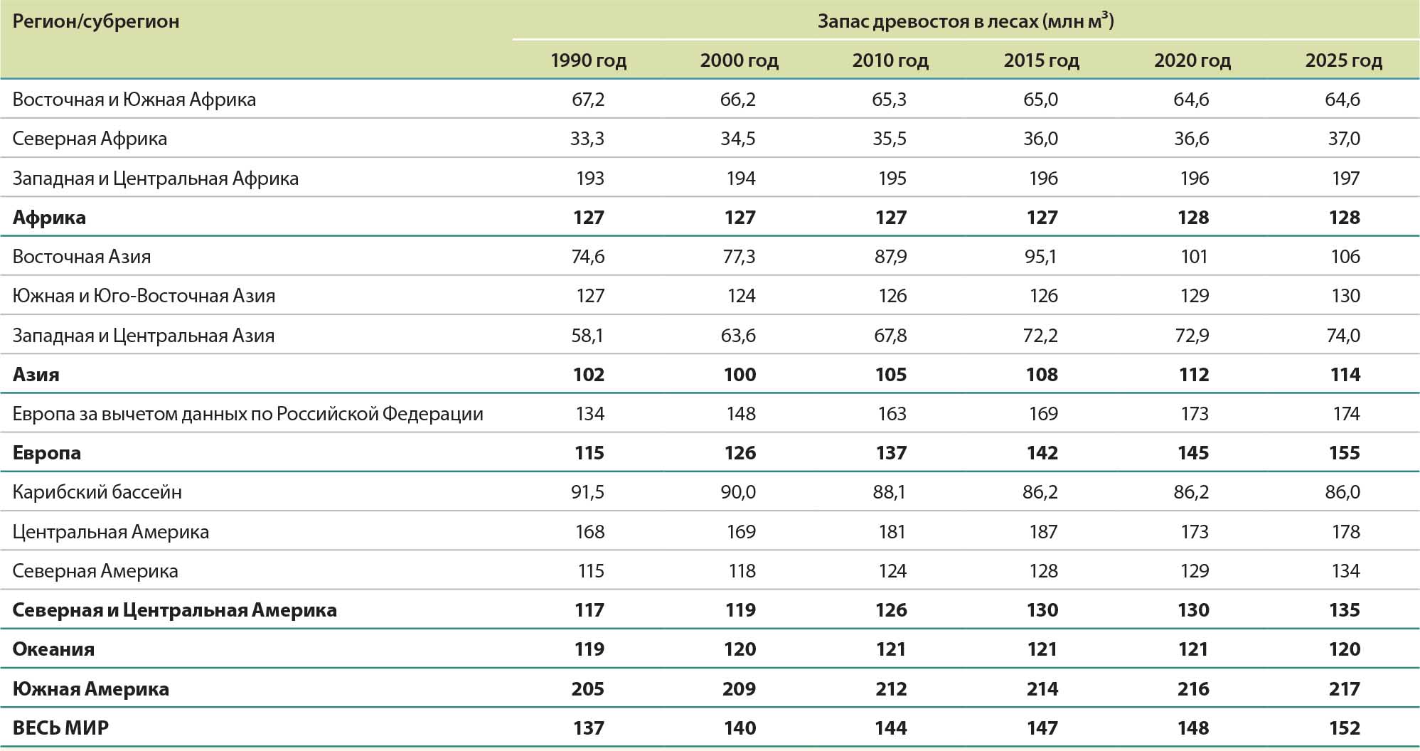 Общий запас древостоя в ПЛЗ в 2025 году оценивается в 20,2 млрд м³ (3 процента от мирового запаса в лесах) (таблица 41). Из этого объема 44 процента приходится на Европу, в первую очередь на Российскую Федерацию.