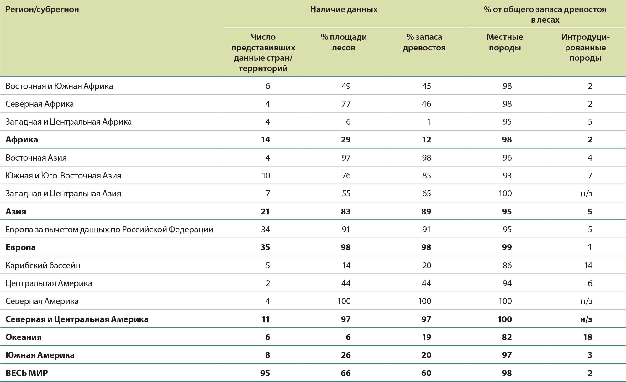По оценкам, мировой запас древостоя на 98 процентов состоит из местных пород деревьев и на 2 процента – из интродуцированных (таблица 46). Местные породы преобладают в составе древостоя во всех регионах; на первом месте по их доле находятся Северная и Центральная Америка (100 процентов) и Европа (99 процентов), а на последнем – Океания (82 процента).