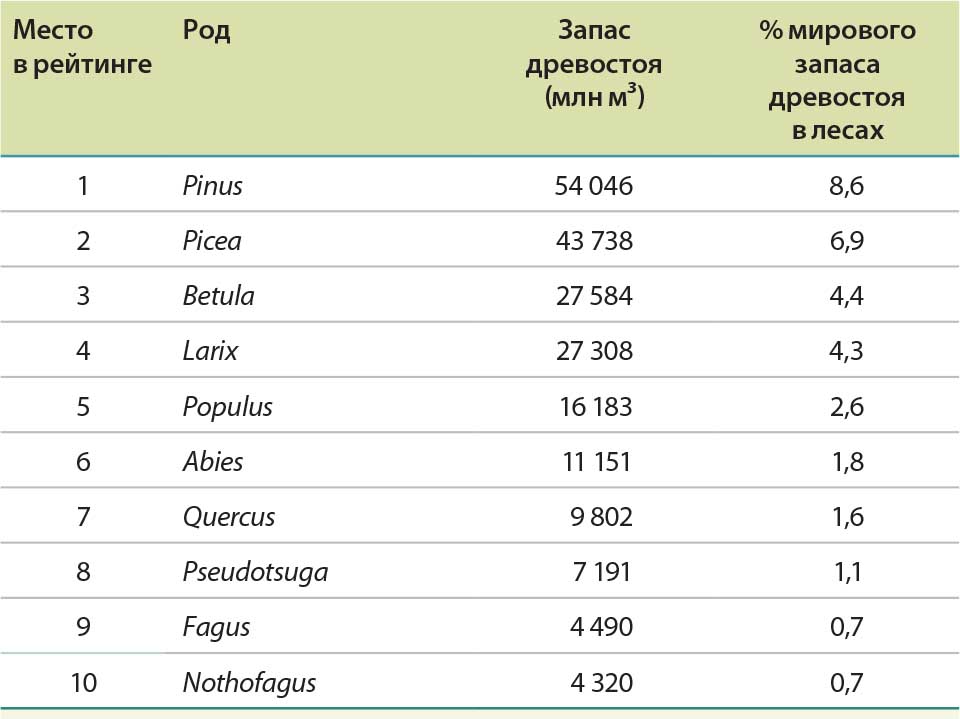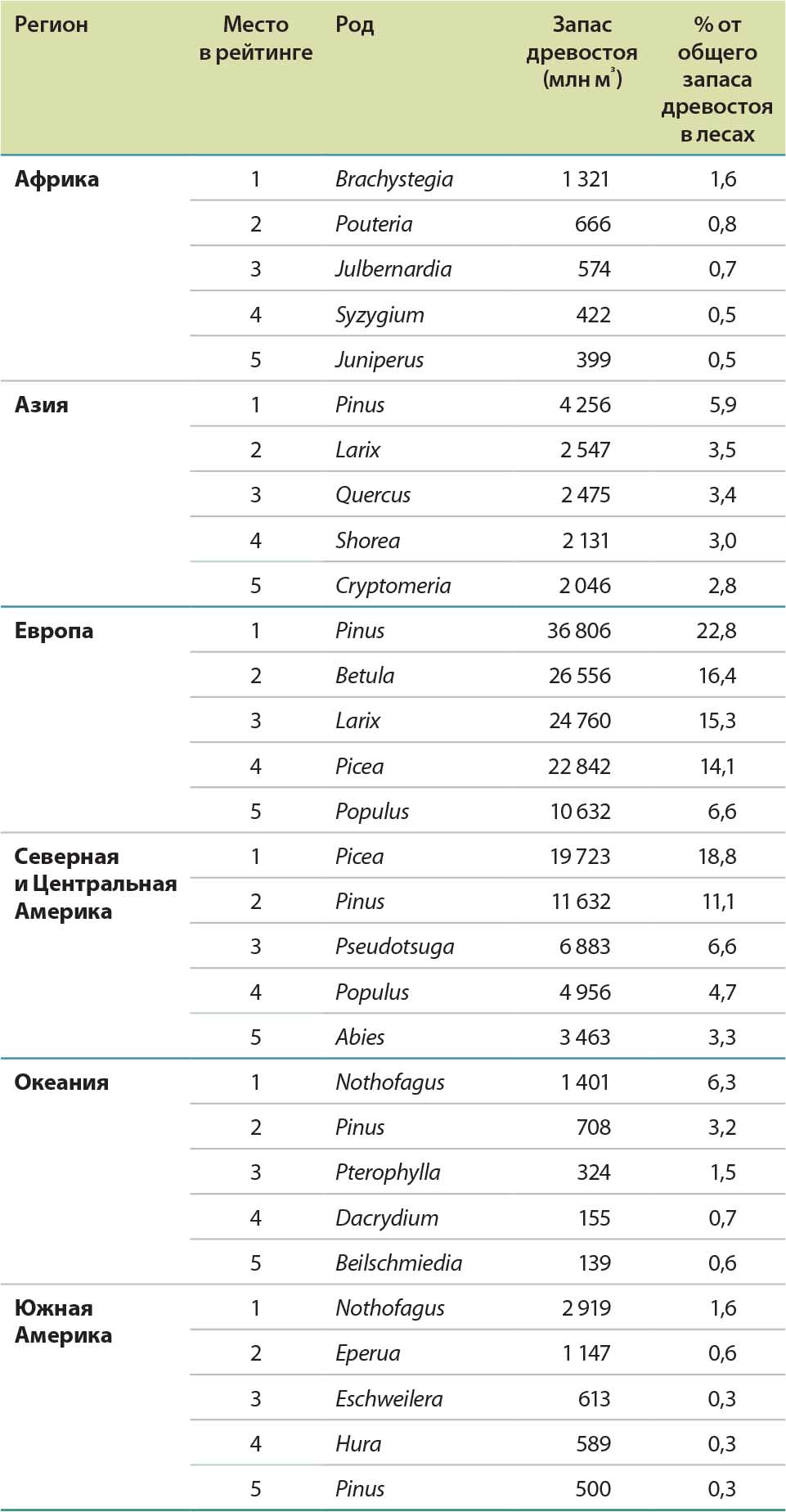 Породы деревьев в составе древостоя, которые упоминались в отчетности как наиболее распространенные местные и интродуцированные, относились к 385 родам. Первое место по числу родов занимали Африка (158) и Азия (127), а следующие – Северная и Центральная Америка (88) и Океания (74). Однако во многих докладах, направленных странами, информация по этому параметру была неполной, а часть стран и территорий представили информацию о составе только на уровне рода. В таблице 47 показаны десять родов с наибольшим запасом древостоя (по объему) в мире, а в таблице 48 – пять родов с наибольшим запасом по регионам.