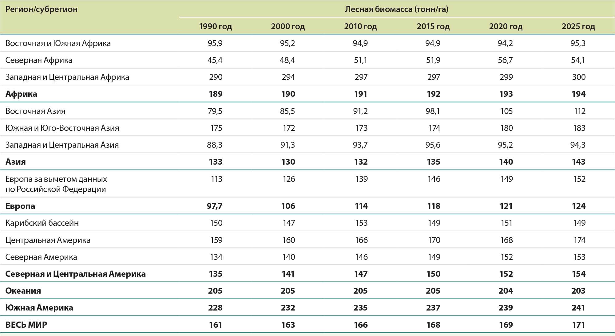 В период с 1990 по 2025 год объем лесной биомассы на единицу площади увеличился на 10,5 тонны на гектар (7 процентов). Рост наблюдался во всех регионах и субрегионах, кроме Карибского бассейна, Восточной и Южной Африки и Океании, где показатель оставался стабильным. Наибольший прирост биомассы на единицу площади в 1990–2025 годах был зарегистрирован в Восточной Азии и Европе (за вычетом данных по Российской Федерации). В глобальном масштабе темпы роста в 1990–2000 годах составляли 0,25 тонны на гектар, а в 2015–2025 годах – 0,35 тонны на гектар в год.