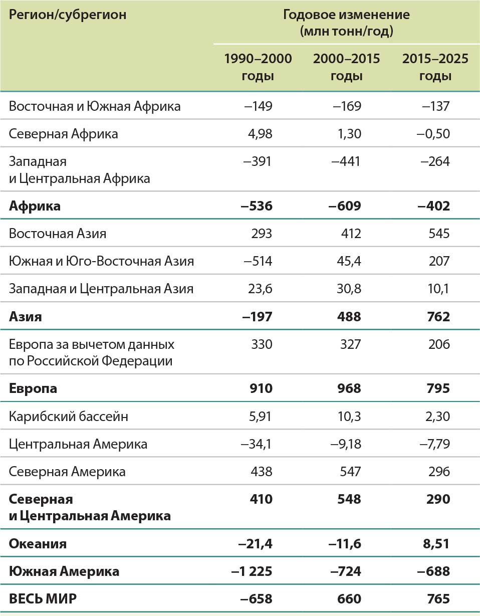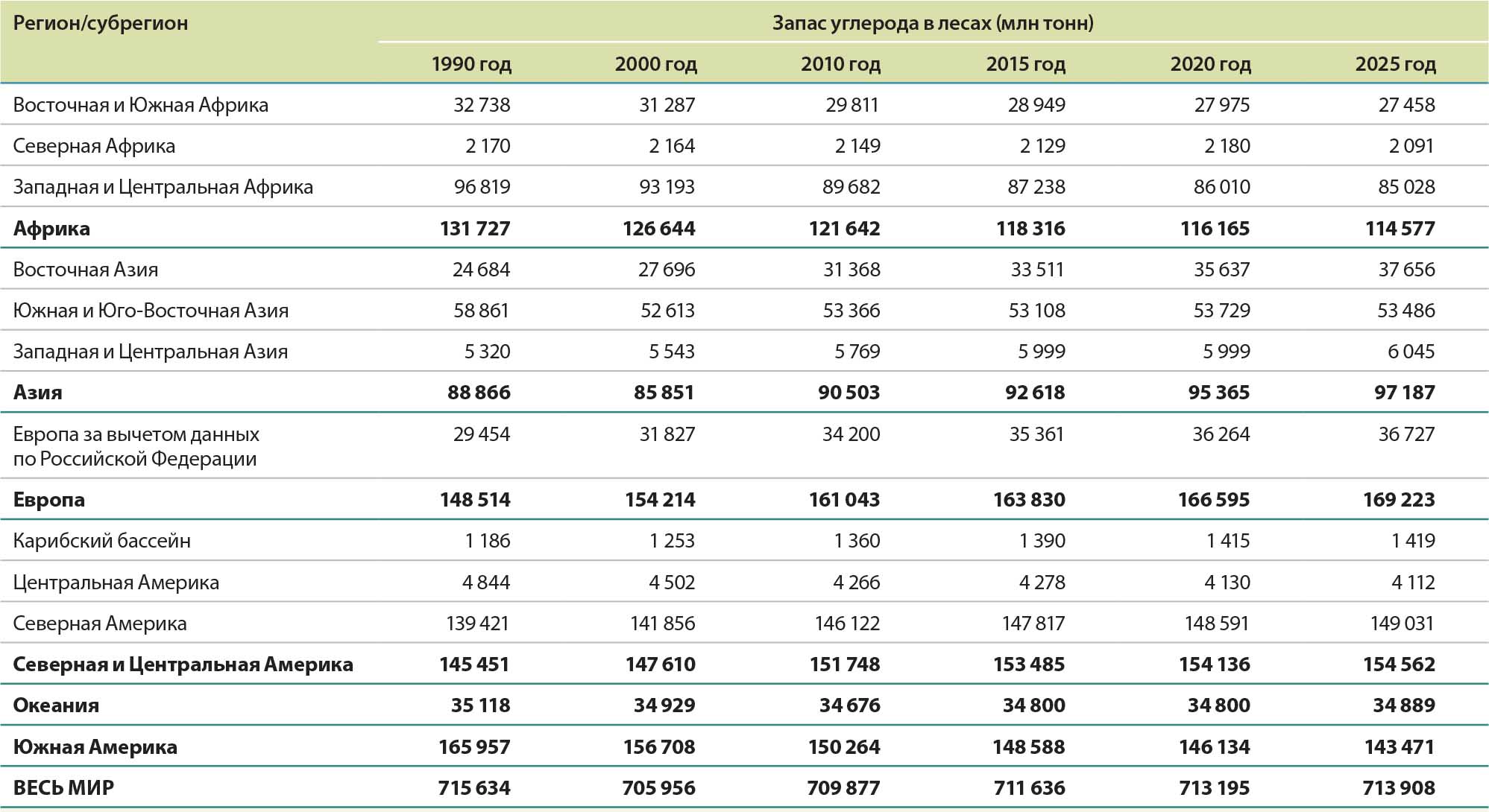 В период с 1990 по 2000 год запасы углерода в лесах мира сократились с 716 Гт до 706 Гт, а затем выросли и в 2025 году достигли 714 Гт (таблица 55). Рост этого показателя в период после 2000 года в основном объясняется расширением площади лесов в ряде регионов, особенно в Азии и Европе. Глобальные запасы углерода в 2025 году были близки к запасам в 1990 году, но картина по регионам и субрегионам была неоднородной. Например, в Восточной Азии, Европе и Северной Америке запасы углерода в лесах в 2025 году были гораздо выше, чем в 1990 году, что связано с расширением площади лесов, а в Южной Америке, Африке и Центральной Америке (в порядке убывания, по темпу изменения) – гораздо ниже (рисунок 28).