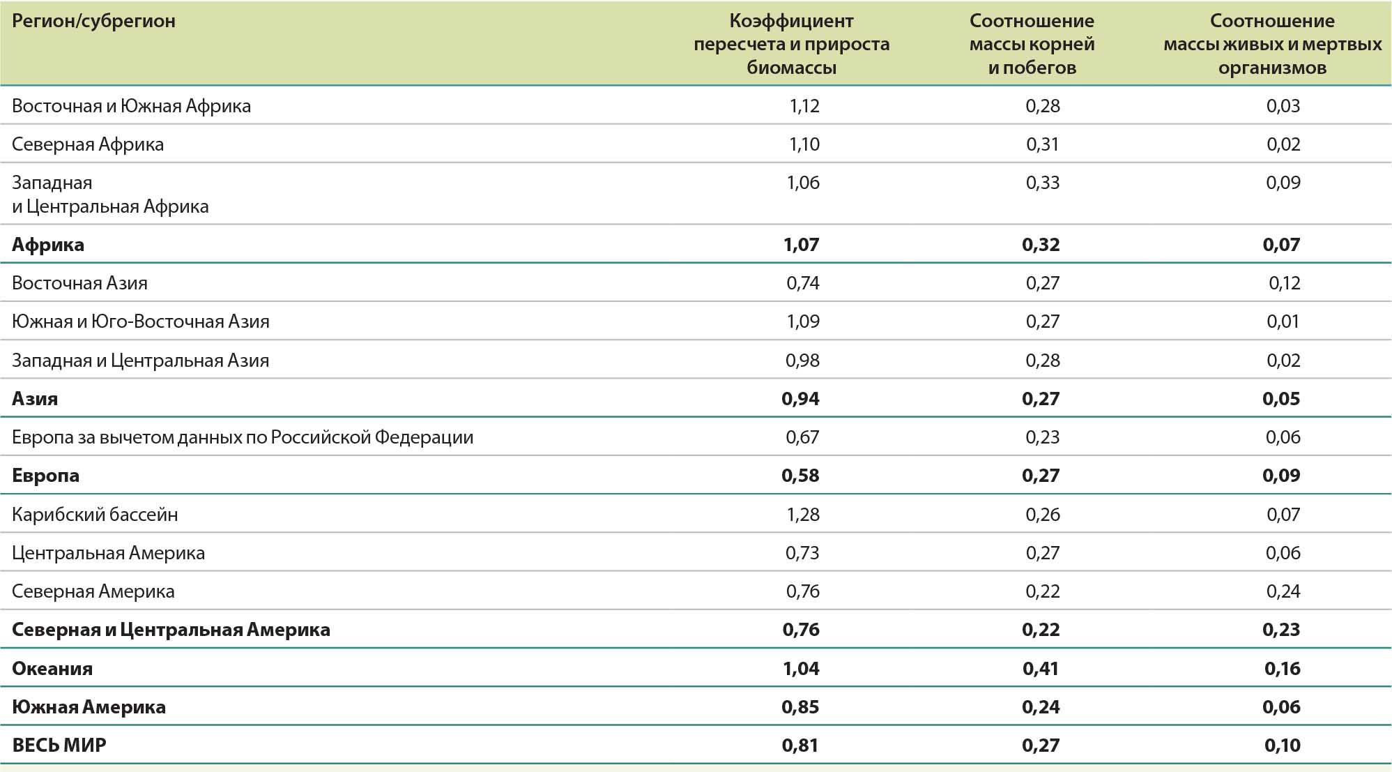 В таблице 53 показаны средний коэффициент пересчета и прироста биомассы (КППБ)11, соотношение массы корней и побегов12 и соотношение массы живых и мертвых организмов13 в разбивке по субрегионам и регионам на основе оценок древостоя и биомассы по состоянию на 2025 год. Рассчитанные коэффициенты согласуются со стандартными диапазонами, установленными МГЭИК.