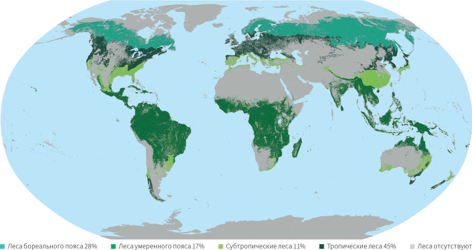Общая площадь лесов на планете составляет 4,14 млрд га – это почти треть (32 процента) общемировой площади суши, или 0,50 га на душу населения. Основная доля мировых лесов (45 процентов) находится в тропическом поясе, а за ним следуют бореальный, умеренный и субтропический пояса1.