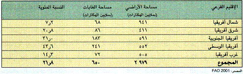تتوزع الغابات والأحراج بصورة غير متساوية بين الأقاليم الفرعية والبلدان، مما يسفر عن تفاوت هام في الطلب والإمداد بالسبع والخدمات المتأتية من الغابات. شمال أفريقيا هو الإقليم الفرعي الأقل غنى بالغابات في أفريقيا حتى تقارب نسبة أراضيه المصنفة كغابات 7%، فيما تصل هذه النسبة إلى 43% في أفريقيا الوسطى. السمة الهامة الأخرى التي تميز وضع الغابات في أفريقيا هي التنوع الكبير في ظروف الإنبات وما ينجم عنها من فروق في إنتاجية الكتلة الحيوية، ففي منطقة السهل تنخفض الكتلة الحيوية الخشبية إلى 4 أطنان/ هكتار، فيما ترتفع في غابات أفريقيا الوسطى الاستوائية المطرية إلى 200 طن/ هكتار. والقسم الأعظم من أفريقيا قاحل، وبالتالي فإن إنتاجية الكتلة الحيوية منخفضة للغاية. ولفروق الإنتاجية تبعات هامة فيما يتعلق بتلبية الطلب على الخشب وغيره من المنتجات، وكذلك على فرص الاستثمار، تتمثل إحدى أهم المشاكل أو بالأحرى أحد النتائج الناجمة عن تأثير العوامل المختلفة، في ارتفاع معدل إزالة الغابات في أفريقيا. ففي الفترة الممتدة بين 1990 و2000، خسرت القارة الأفريقية قرابة 52 مليون هكتار من الغابات أي ما يعادل 56% من الانخفاض العالمي في الغطاء الحرجي، وهناك اختلافات كبيرة في نسبة تراجع الغطاءالحرجي بين مختلف الأقاليم الفرعية وبين البلدان، حيث سجلت أفريقيا الجنوبية حوالي 31% من تراجع الغطاء الحرجي في أفريقيا، وسجلت ثلاثة بلدان هي السودان وزامبيا وجمهورية الكونغو الديمقراطية قرابة 44% من إزالة الغابات في أفريقيا. لكن بعض البلدان توصلت إلى قلب الخسارة عبر إعادة التشجير والتشجير، وإن ظلت الظاهرة نادرة للغاية.