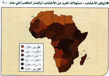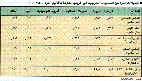 ارتفع إنتاج أفريقيا من الأخشاب (بما فيها حطب الوقود والخشب الصناعي المستدير) من 340 مليون متر مكعب في 1980 إلى 699 مليون متر مكعب في عام 2000. ومما يميز إنتاج الأخشاب و استهلاكها في أفريقيا انخفاض نسبة المنتجات ذات القيمة المضافة، ففي عام 2000 استخدم 91% من الخشب كوقود. وتتراجع حصة أفريقيا من الإنتاج العالمي تدريجيا مع ارتفاع مستوى التجهيز. متوسط استهلاك الفرد من الخشب المستدير في أفريقيا أكبر من المتوسط العالمي، فقد بلغ 250% من المتوسط في آسيا وكان أكبر من المتوسط الأوربي في عام.2000. تتمثل أهم الفوارق في كيفية استهلاك الخشب فالمشاكل الأساسية على صعيد استهلاك الأخشاب ومشتقاتها ترتبط بما يلي: