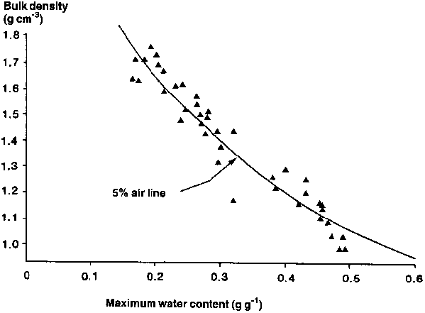 The effect of error in the assumed e values is not large. For example, if the true e = 0.10 cm³ cm-3, and assumed e = 0. 05 cm³ cm-3, then for q gmax = 0.50 g g-1, calculated bulk density reduces from 1.08 to 1.03 g cm-3. This is an error of less than 5%.