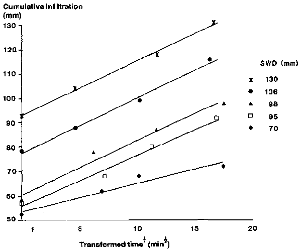 As an alternative, we built 25 m² mini-bays with a continuous, thin metal wall buried to about 120 cm, resulting in a water-tight, undisturbed, non-weighing lysimeter. The bays allowed a representative cracking pattern under row crop conditions to be sampled. Details on construction and measurement are given in Shaw and Yule (1978) and Gardner (1978). Infiltration was measured at different antecedent moisture contents by rapidly flooding the bay and thereafter maintaining fully-ponded conditions for 5-24 hours. In a wide range of Vertisols, two-thirds of the total net water addition was instantly taken by the soil to fill the crack volume. An example of this infiltration behaviour is shown in Figure 3, where cumulative infiltration is plotted as a function of the square root of elapsed pondage time. The Y axis intercept is the crack volume, while the slope of the line equals the sorptivity (S) (Philip, 1969).