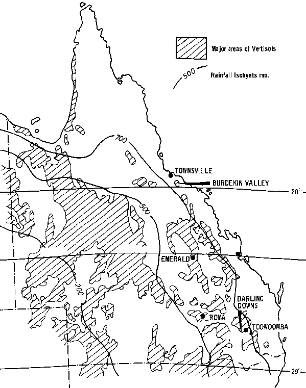 Figure 5. Map of Queensland showing the distribution of Vertisols and mean annual rainfall isohyets.