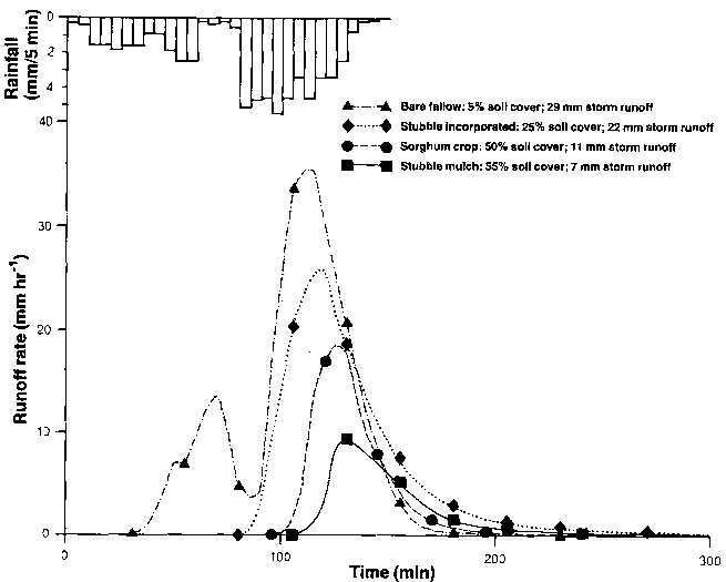 One possible reason for difficulties in reducing runoff is that, unlike the monsoons of India and parts of Africa, rain during the Queensland summer falls in small (<70 mm), well-spaced storms, which allows the shrinkage cracks to swell shut near the surface. Consequently, during the latter half of the fallow, much of the rainfall must infiltrate vertically through the soil matrix, and it is under these conditions that runoff responses to surface cover and surface roughness are observed (Freebairn and Wockner, 1986). Surface cover serves an important secondary role in reducing peak storm runoff rates, which has obvious implications to the design ratings of hydraulic structures. Figure 6, taken from Freebairn et al (1986c), shows an example of this response.