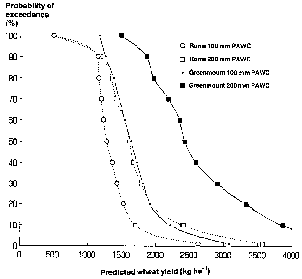 For a PAWC of 100 mm, the median yield (yield at 50% probability of exceedence) at Greenmount (eastern southeast Queensland) was 1600 kg ha-1 compared with 1300 kg ha-1 for Roma (western southeast Queensland). The yield difference is not large although median growing season rainfall was 250 mm and 195 mm, respectively. However, if PAWC is 200 mm, median wheat at Greenmount increases dramatically to 2400 kg ha-1, while at Roma the increased yield is only 1600 kg ha-1. The reason is that the probability of actually filling the 200 mm PAWC profile at Roma during a summer fallow is much less than at Greenmount. Median profile water stores at planting were 180 and 135 mm (data not shown). Thus soils with large PAWC may confer only a small yield advantage in dry areas because they are rarely filled to capacity. Similarly, in areas (or years) of high growing-season rainfall, large PAWC values will also confer little yield advantage.